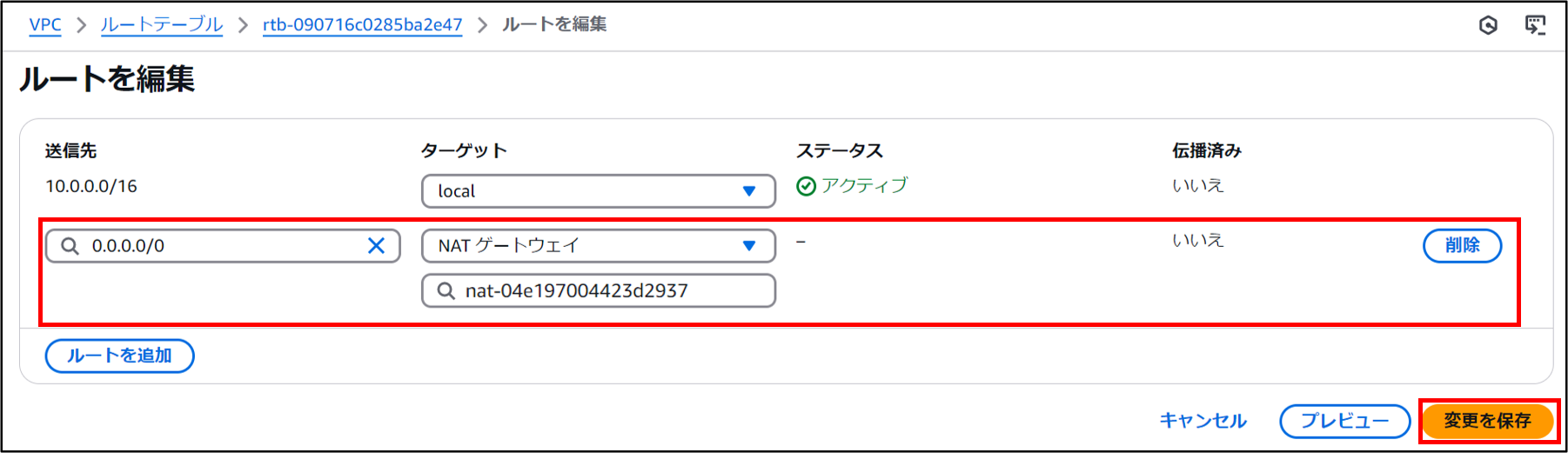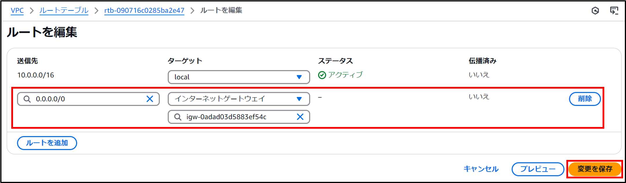 サブネットのネットワーク(0.0.0.0/0)からインターネットゲートウェイへのルーティングを行い、[変更を保存]をクリックします。