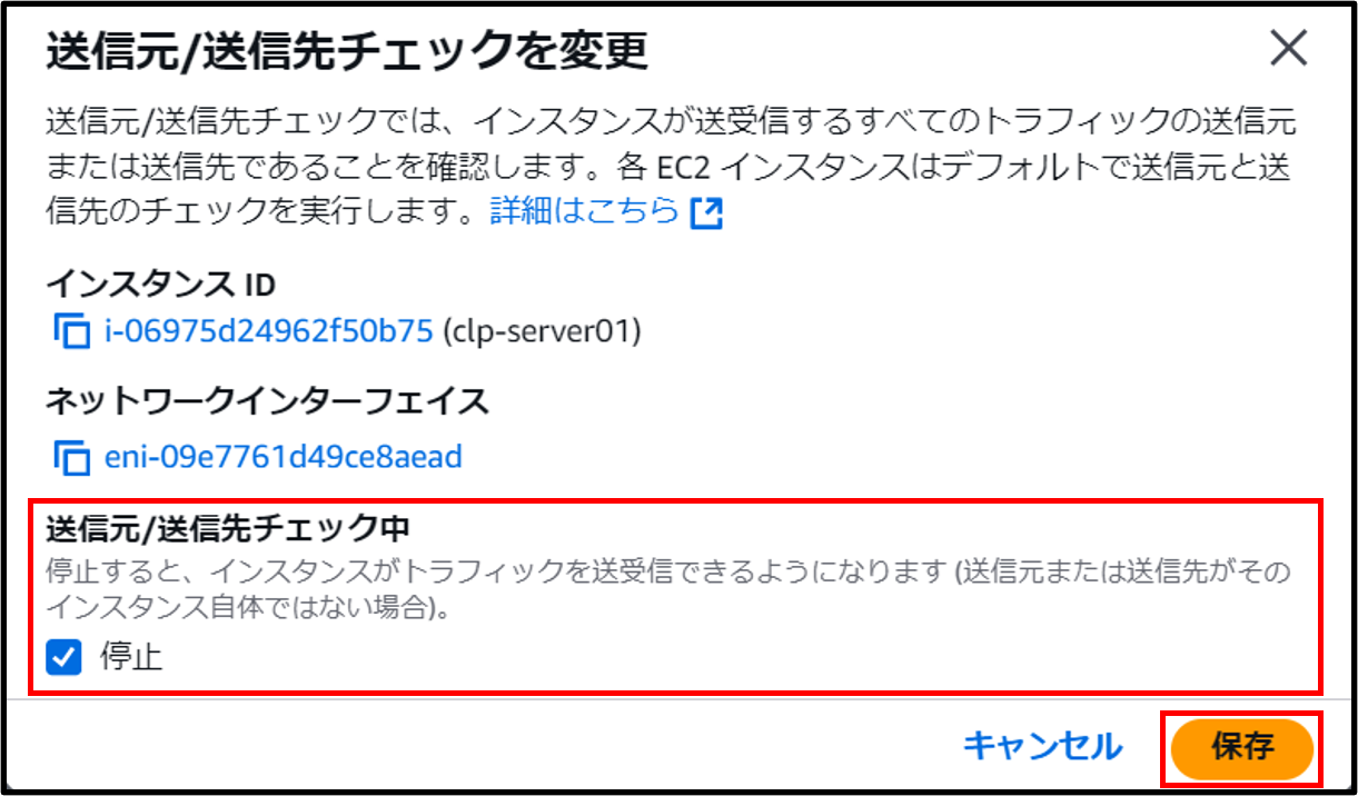 「送信元/送信先チェック中」の「停止」のチェックボックスにチェックを入れ、[保存]をクリックします。