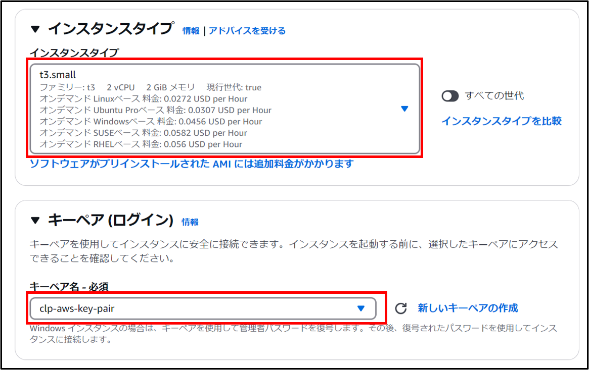 インスタンスタイプとキーペアを選択します。キーペアは、Windowsの場合は初期パスワードの取得、Linuxの場合はSSH接続に利用するセキュリティ認証情報です。既存のキーペアを選択するか、[新しいキーペアの作成]から新たに作成します。