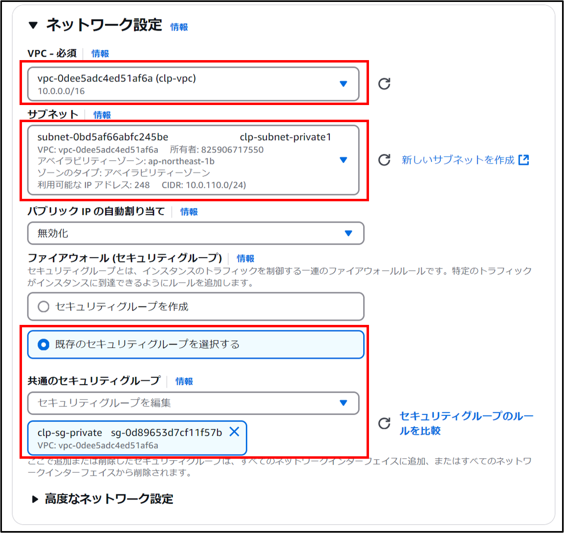 ネットワーク設定を行います。[VPC]は「clp-vpc」を、[サブネット]は「clp-subnet-private1」を選択します。[セキュリティグループ]は[既存のセキュリティグループを選択する]から「clp-sg-private」を選択します。
