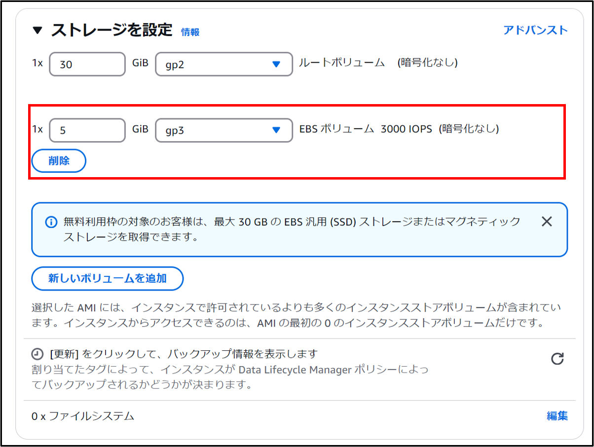 ストレージ設定を行います。今回はミラーディスク構成のため、ディスクを追加します。[新しいボリュームを追加]を選択してEBSボリュームを追加します。