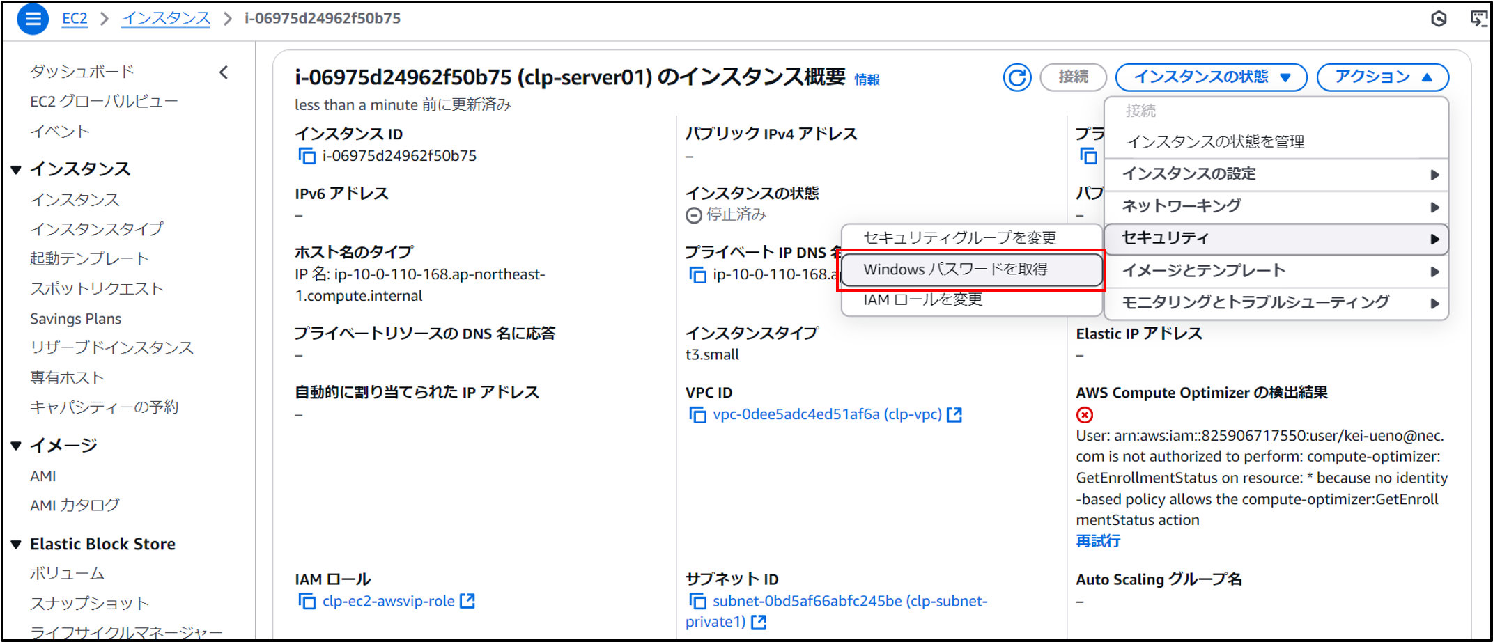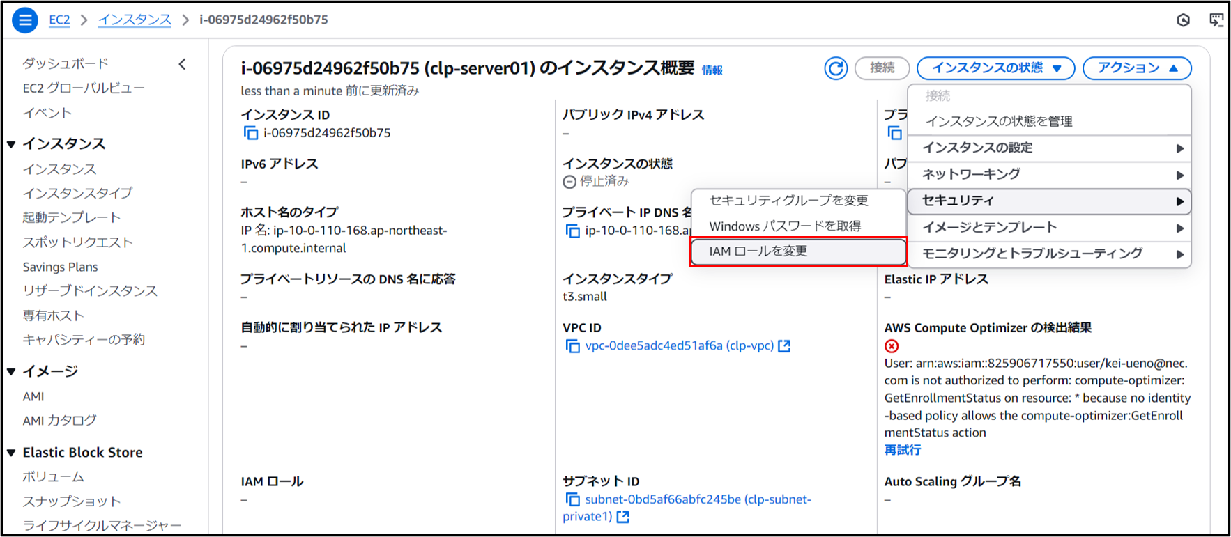 作成したインスタンスにIAMロールをアタッチします。EC2のメニューのインスタンス一覧からclp-server01を選択します。インスタンスIDをクリックして概要を表示します。[アクション]→[セキュリティ]→[IAMロールを変更]を選択します。