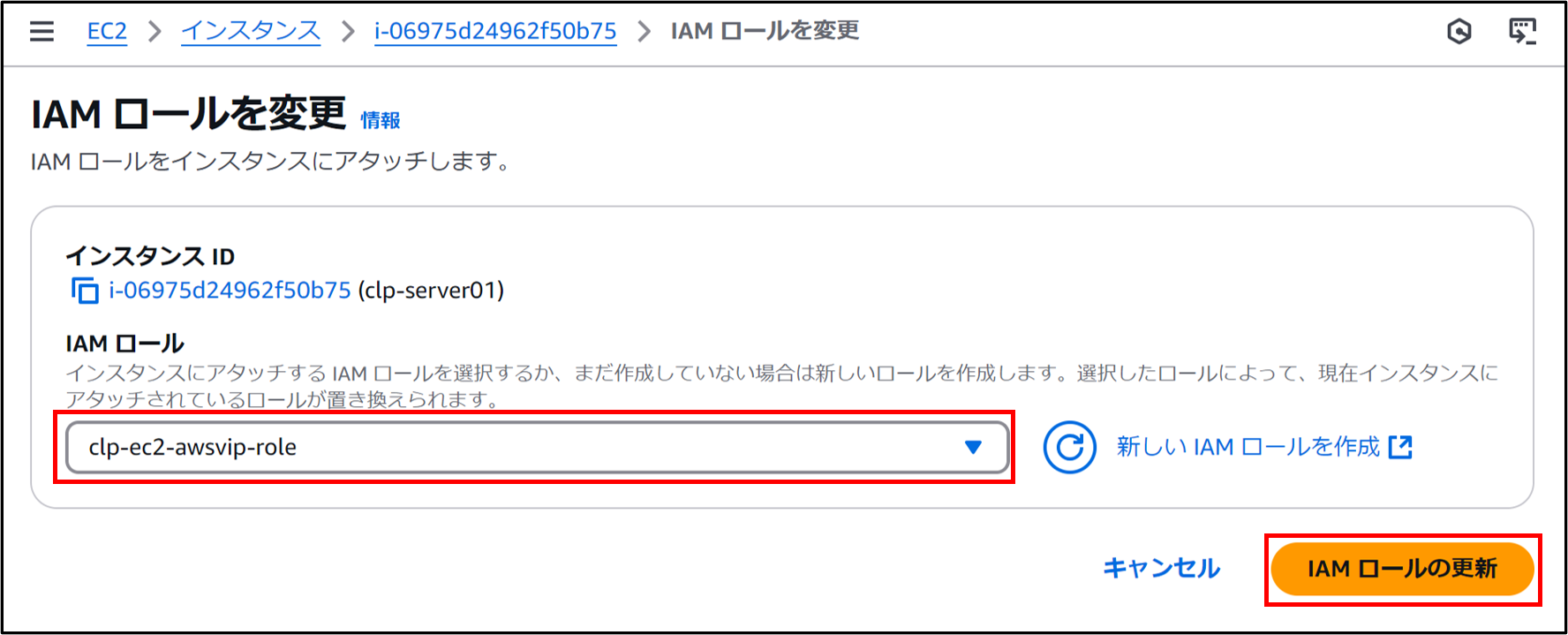 clp-ec2-awsvip-roleを選択し、[IAMロールの更新]をクリックします。