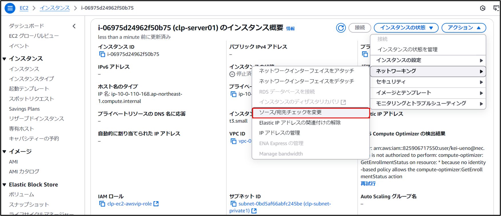 AWS仮想IPリソースで設定するVIPアドレスを利用した通信を行うために、[送信元/送信先チェック]を停止する必要があります。[アクション]→[ネットワーキング]→[ソース/宛先チェックを変更]を選択します。