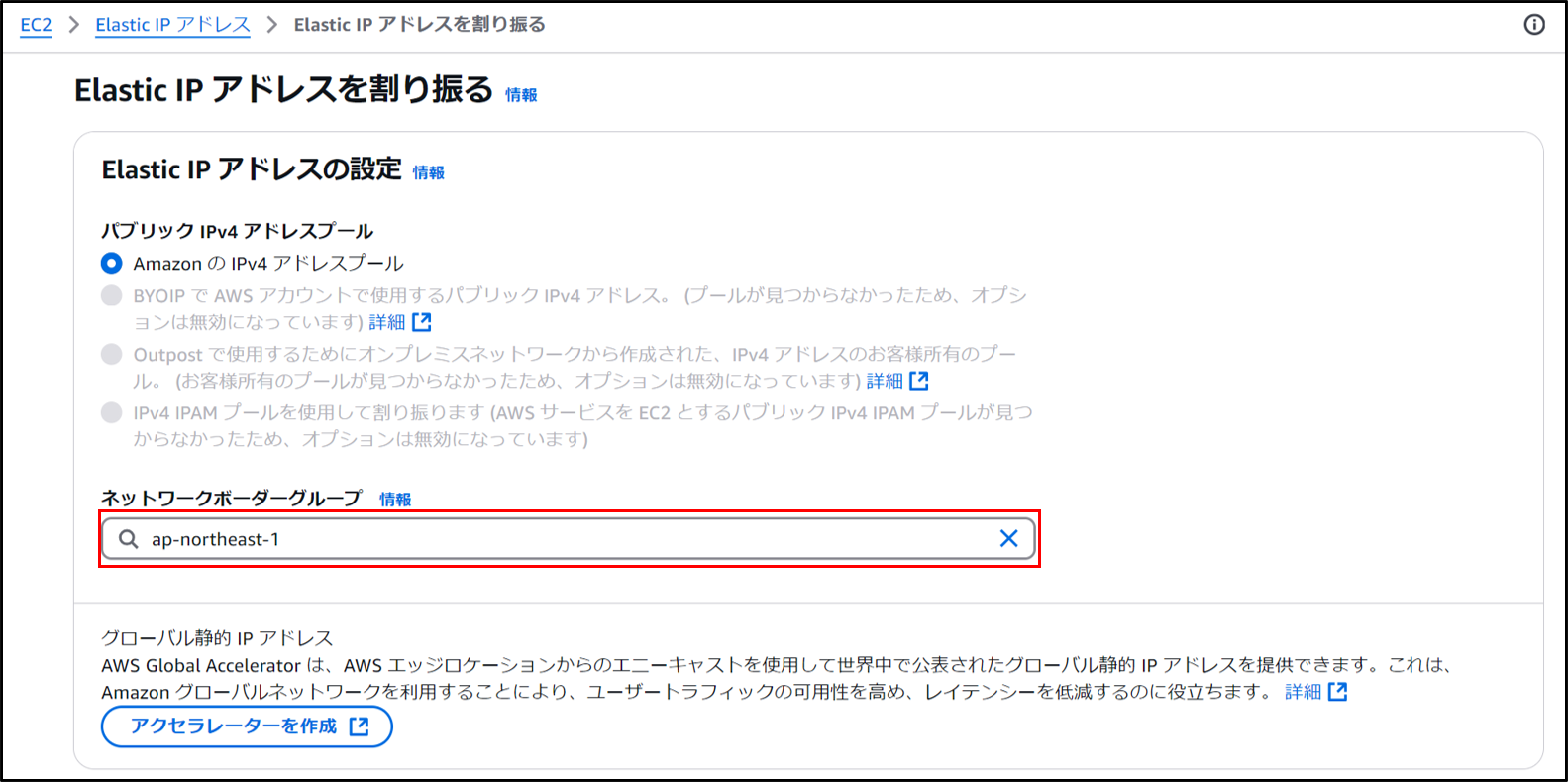 インターネット経由でクライアント用インスタンスに接続するために、起動したインスタンスにElastic IPアドレスを割り当てます。EC2サービスのメニューから[Elastic IP]→[Elastic IPを割り振る]をクリックします。[ネットワークボーダーグループ]でリージョン(ap-northeast-1)を選択し、[割り当て]をクリックします。
