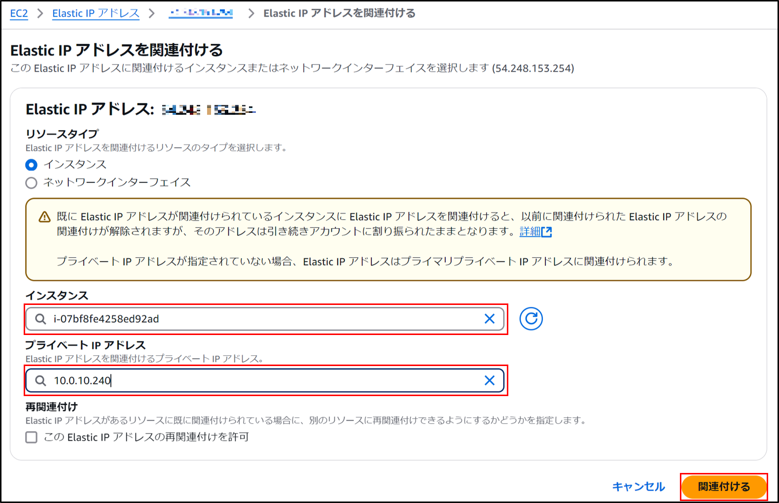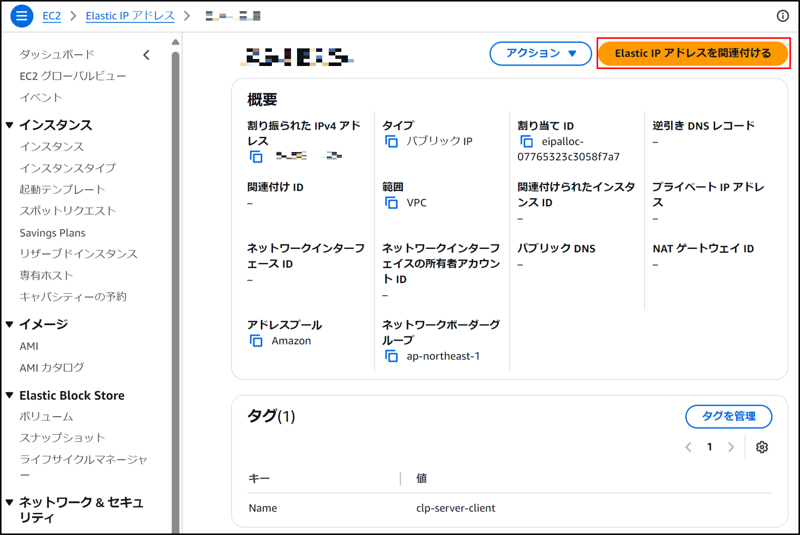 割り当てたElastic IPをクライアント用インスタンスに関連付けます。