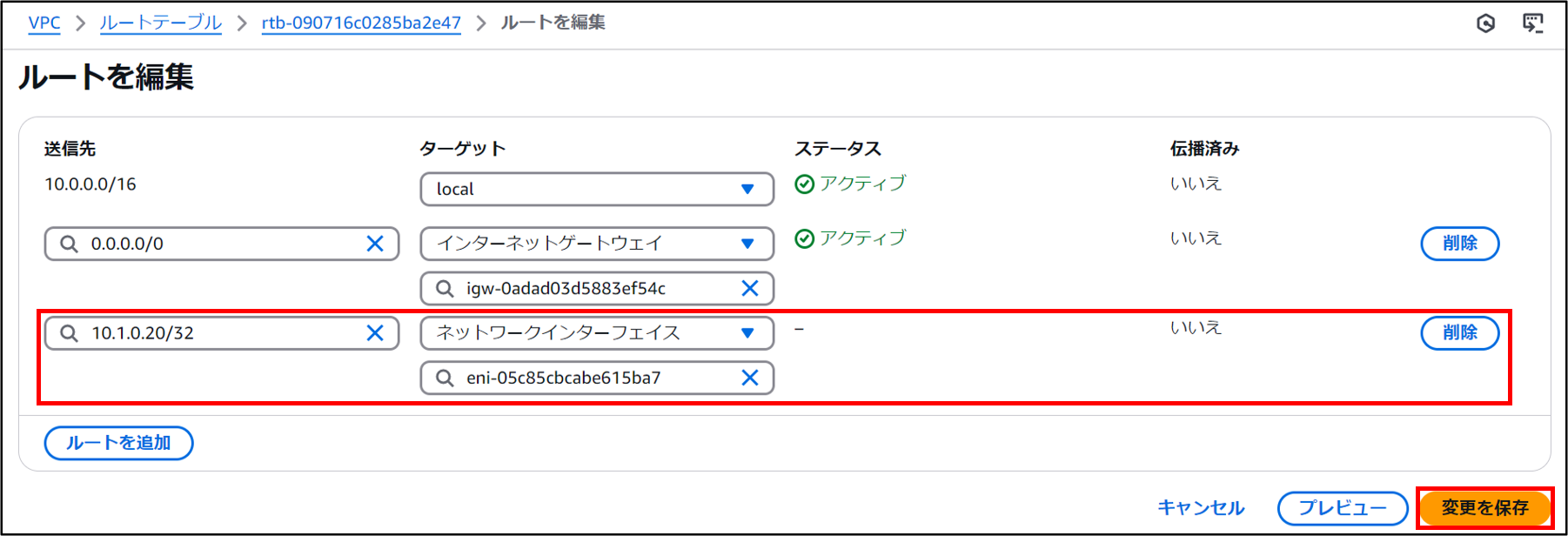 AWS仮想IPリソースを利用するために、ルートテーブルのルーティング設定を追加します。