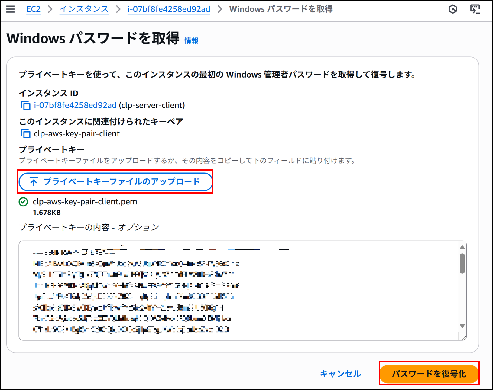 OSはWindowsを選択し、RSA形式のキーペアを選択または作成します。今回はクライアント用インスタンス用に「clp-aws-key-pair-client.pem」を作成しました。[名前]にclp-clientと入力し、サブネットにclp-subnet-public1を選択、セキュリティグループにclp-sg-publicを選択して、[インスタンスを起動]をクリックします。