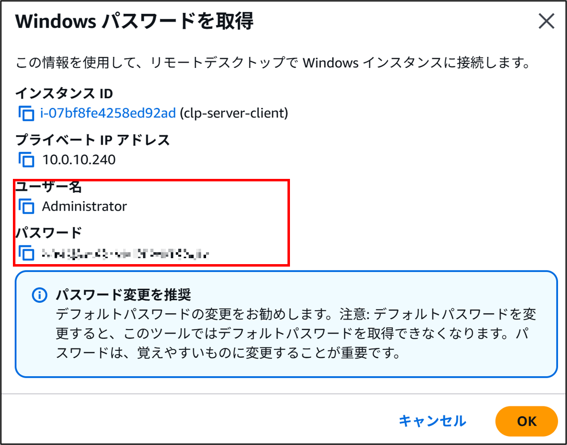 [パスワードを復号化]をクリックするとRDP接続に必要な情報が表示されます。ユーザー名、パスワードを控えておきます。