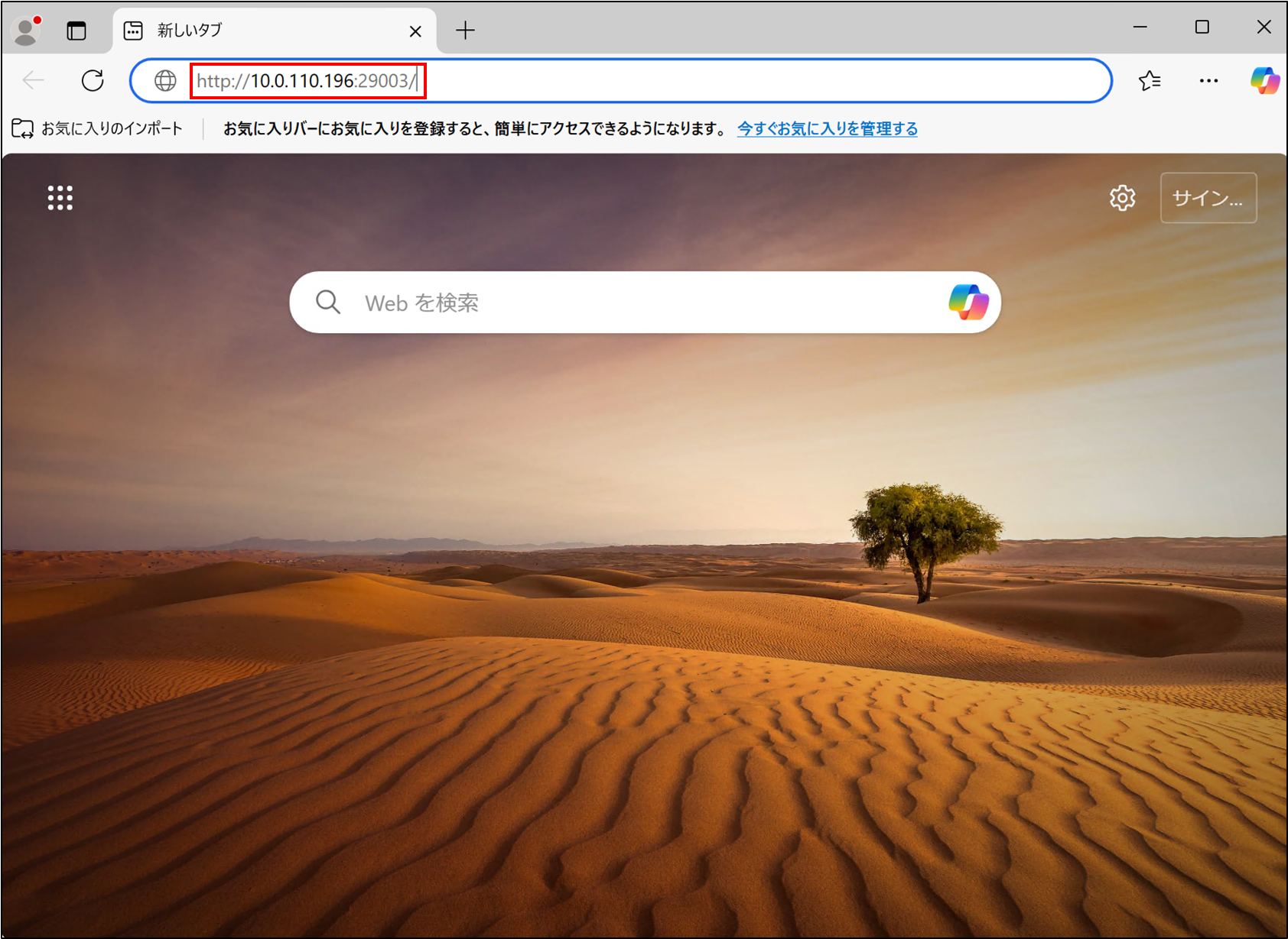 クライアント用インスタンスでWebブラウザを起動します。WebブラウザのアドレスバーにHAクラスターのマスタサーバーに設定するサーバーのIPアドレスとポート番号(既定値:29003)を入力します。