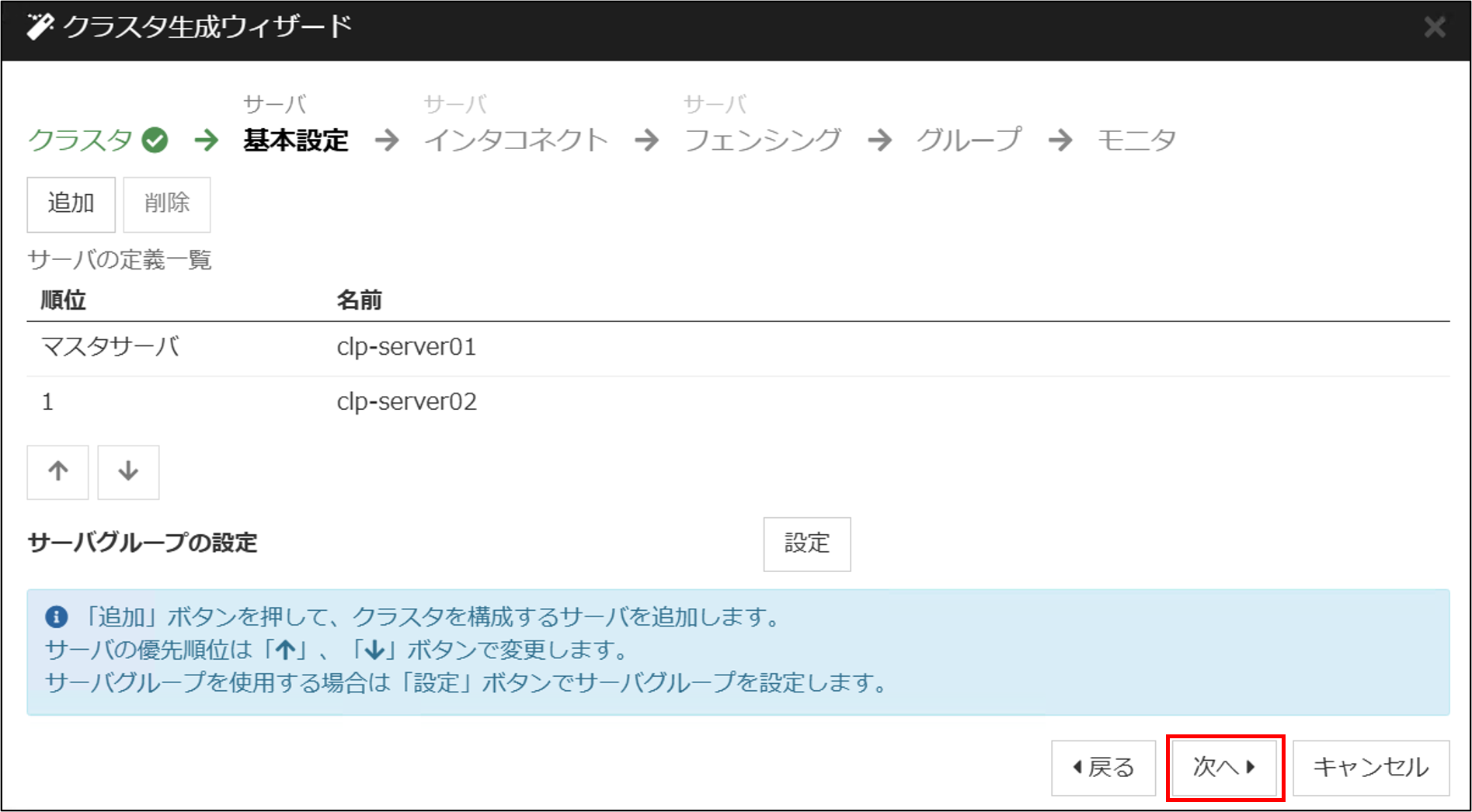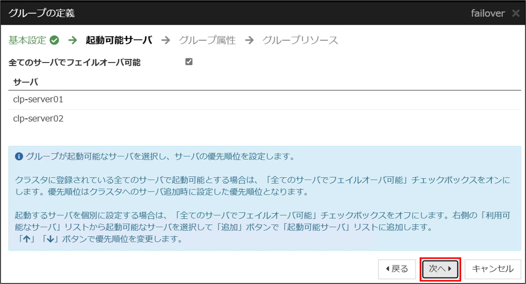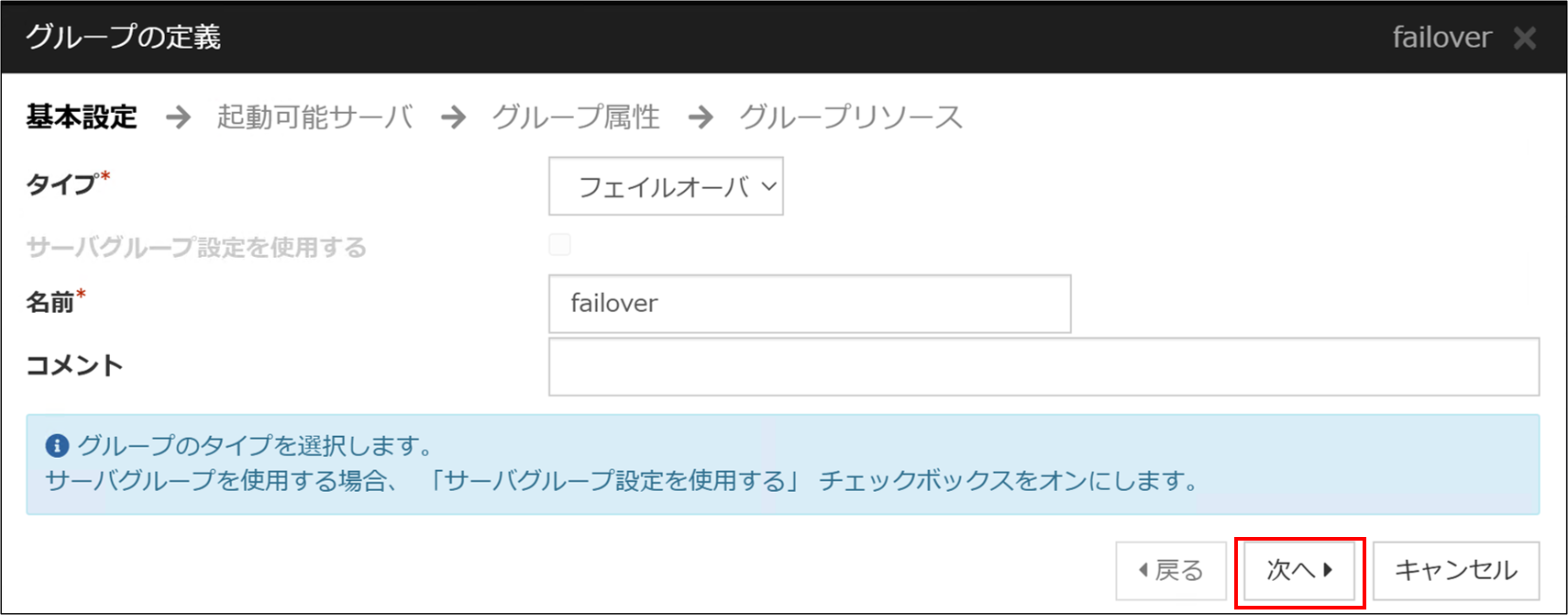 フェールオーバーグループの設定が完了したら[次へ]を選択します。