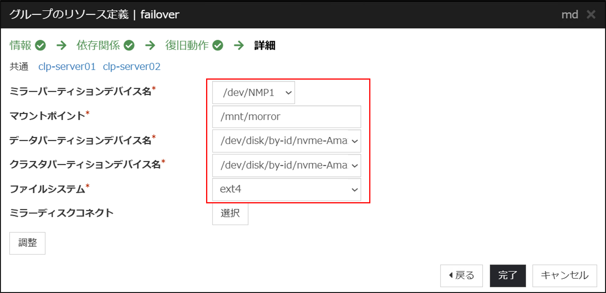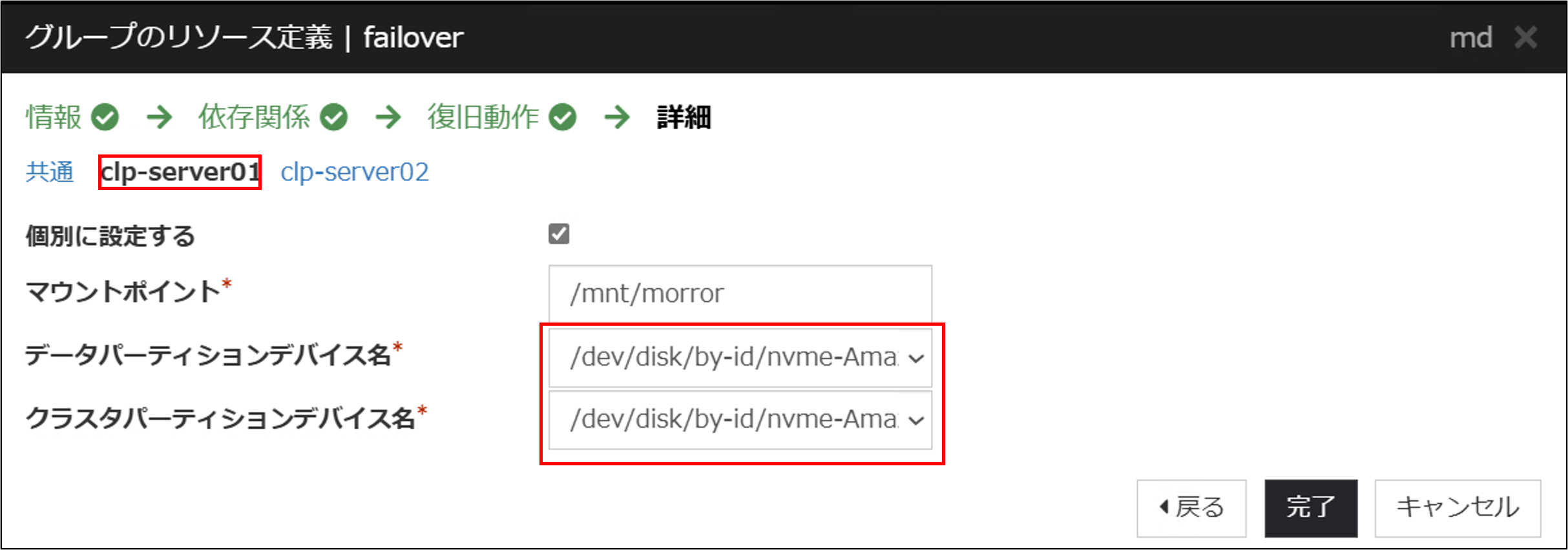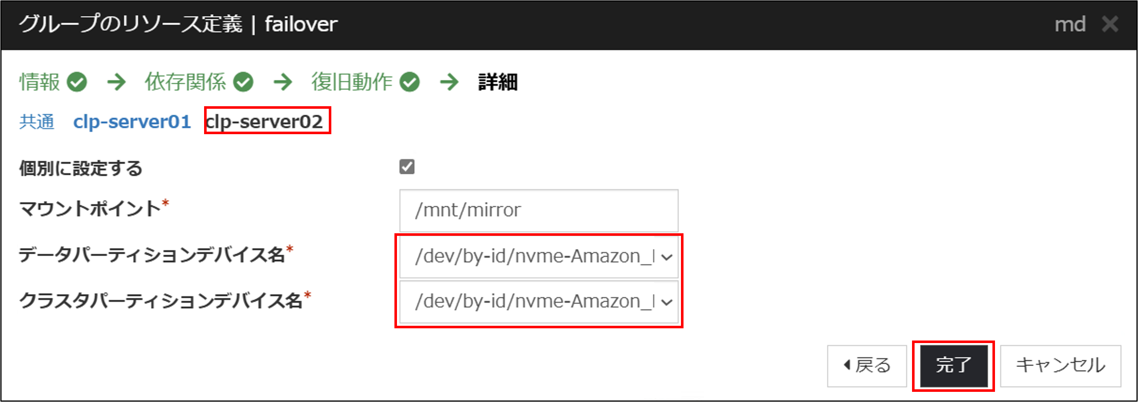 clp-server02タブにおいても「2.2 ミラーディスクの準備」で調べたclp-server02のby-idを個別設定します。[完了]をクリックして選択を完了します。