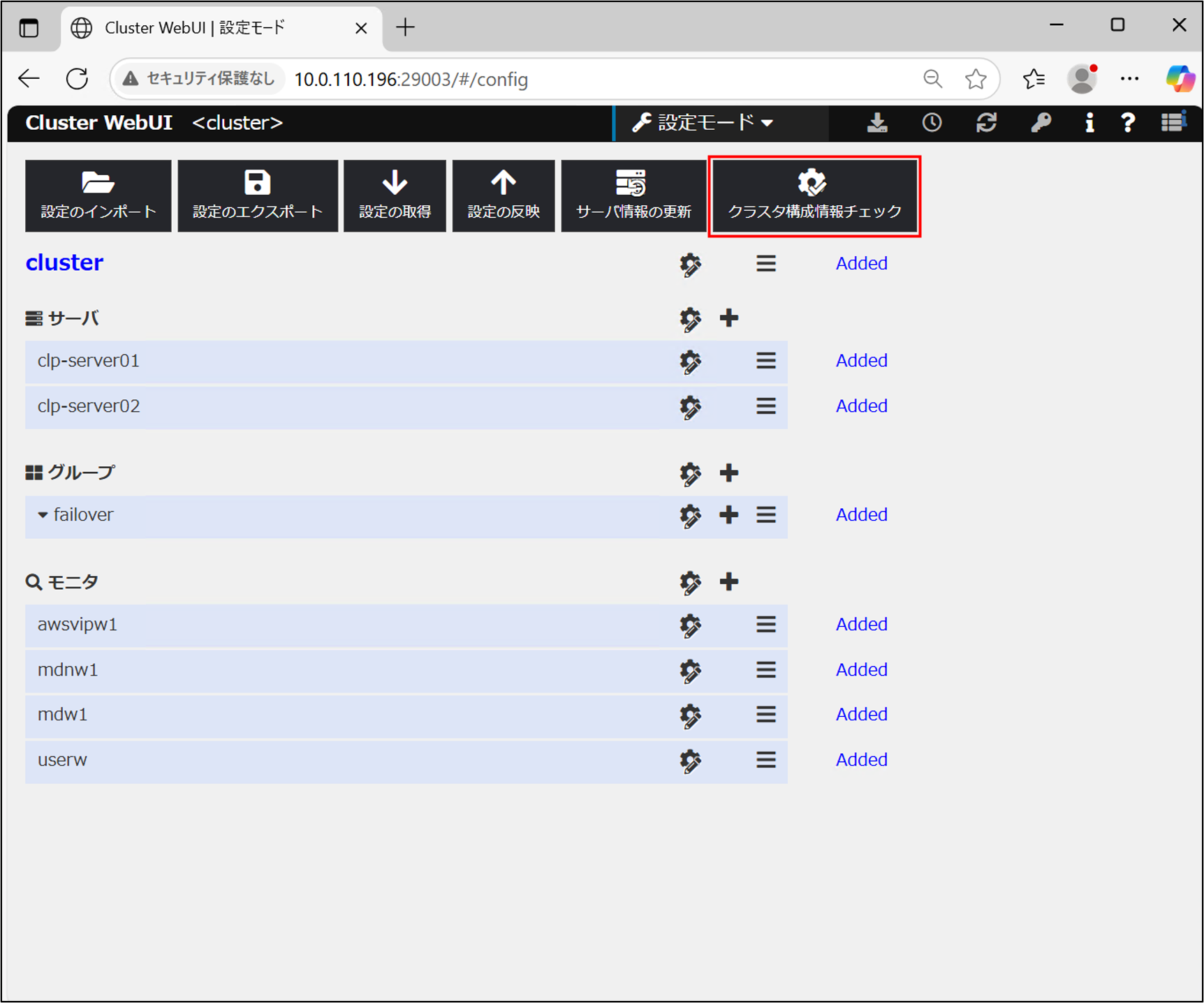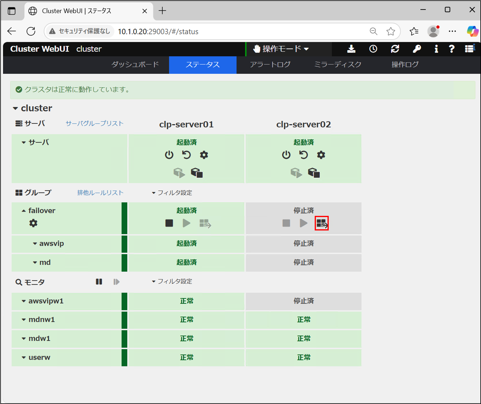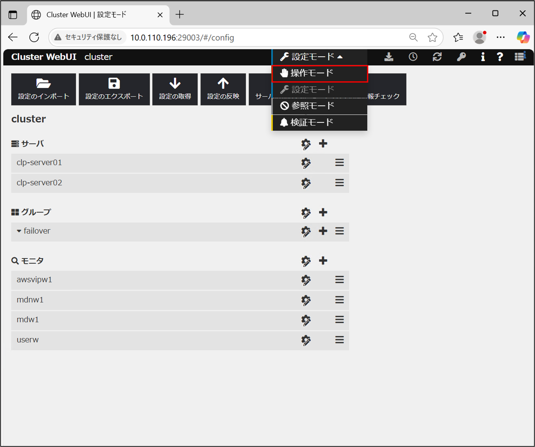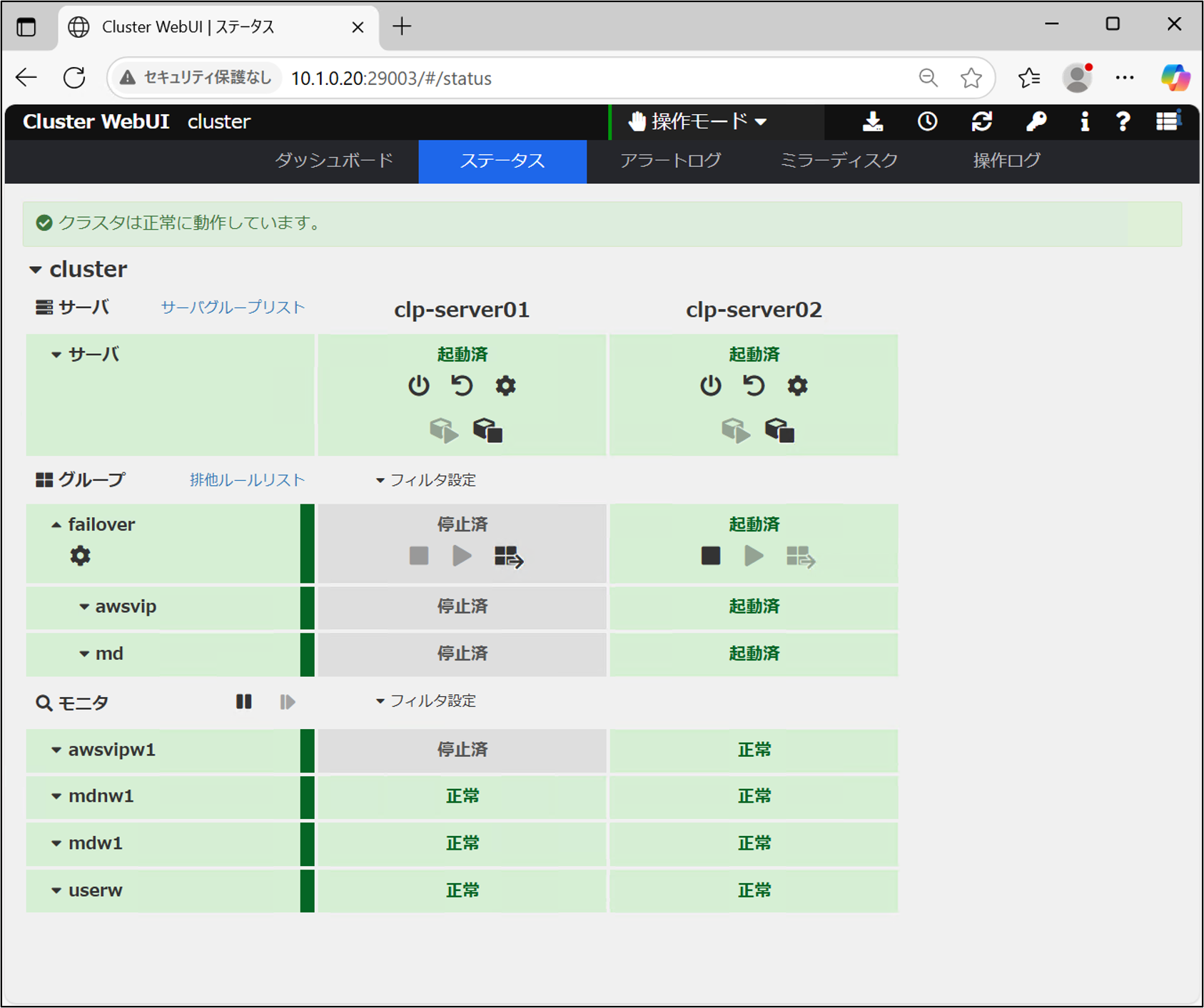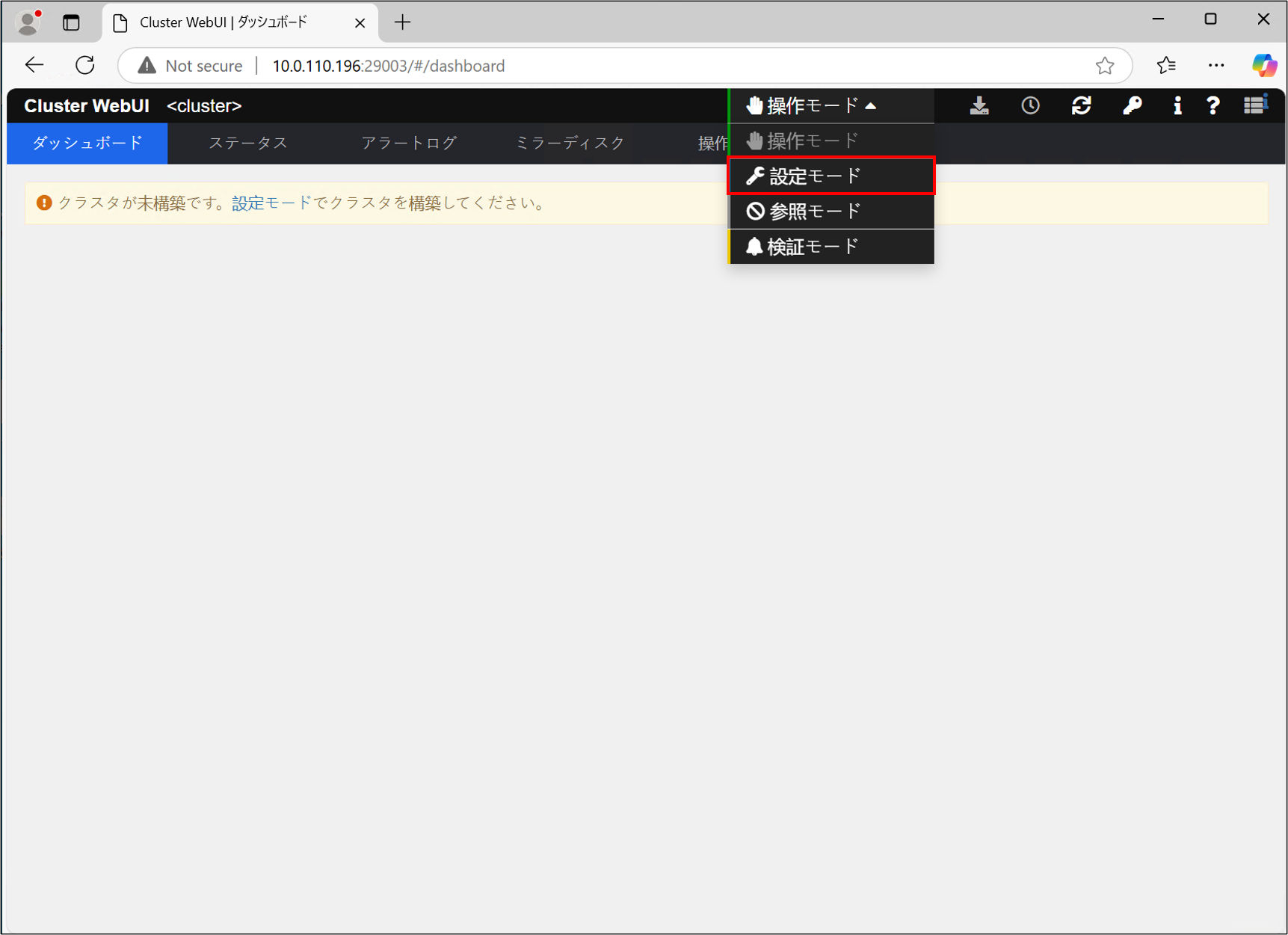 サーバーが起動したらCluster WebUIに再接続し、モードを操作モードに切り替えます。