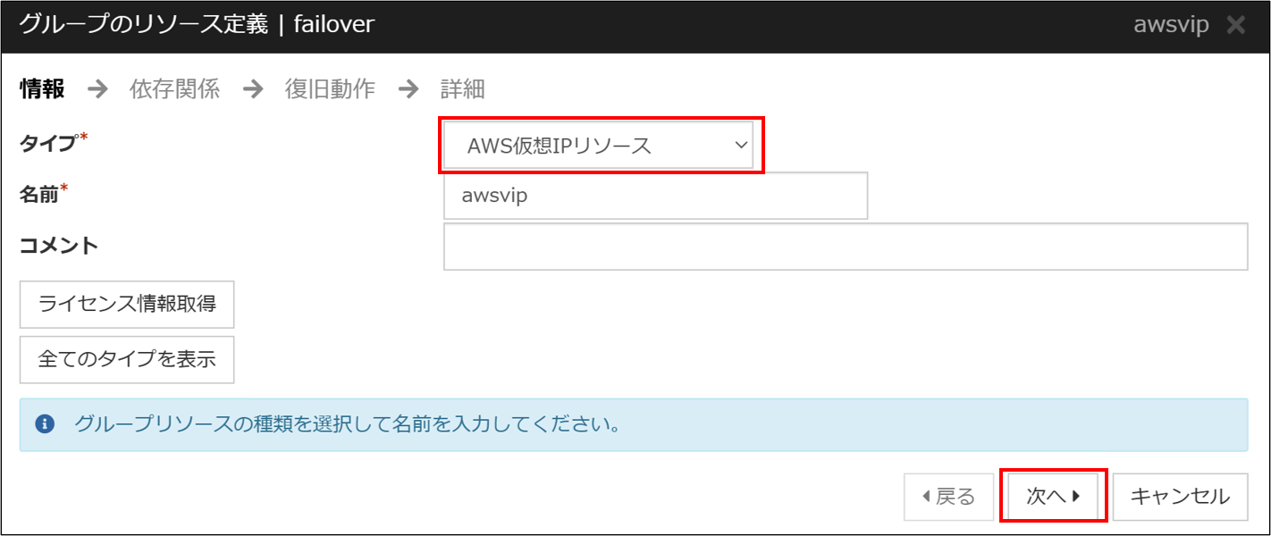 次にAWS仮想IPリソースを設定します。[タイプ]から[AWS仮想IPリソース]を選択します。