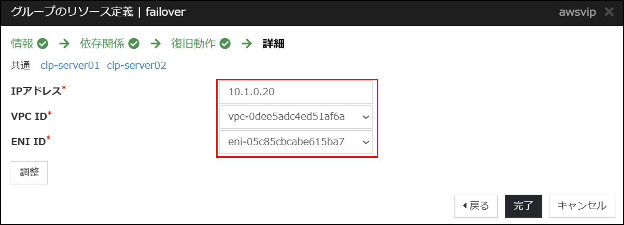 依存関係設定のページ、復旧動作設定のページは既定値のまま[次へ]をクリックし、詳細設定のページを表示します。共通タブでは利用するVIPをIPアドレス欄に入力します。VPC IDおよびENI IDはドロップダウンリストから選択できますので、EC2インスタンスが属するVPC IDとclp-server01のENI IDを設定します。