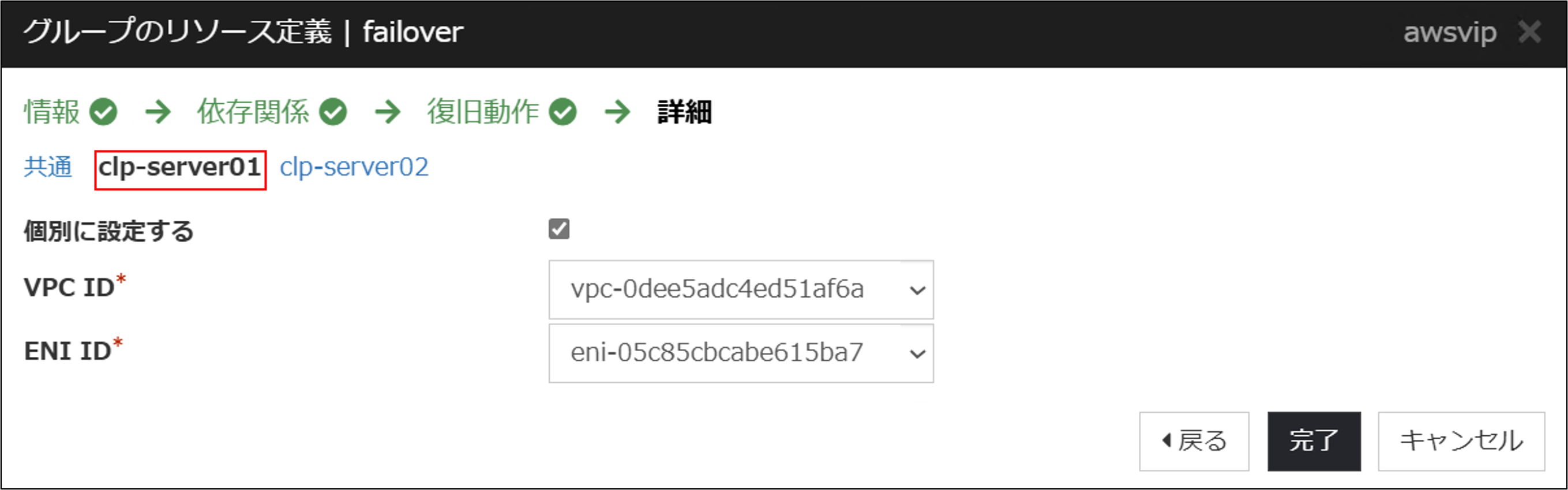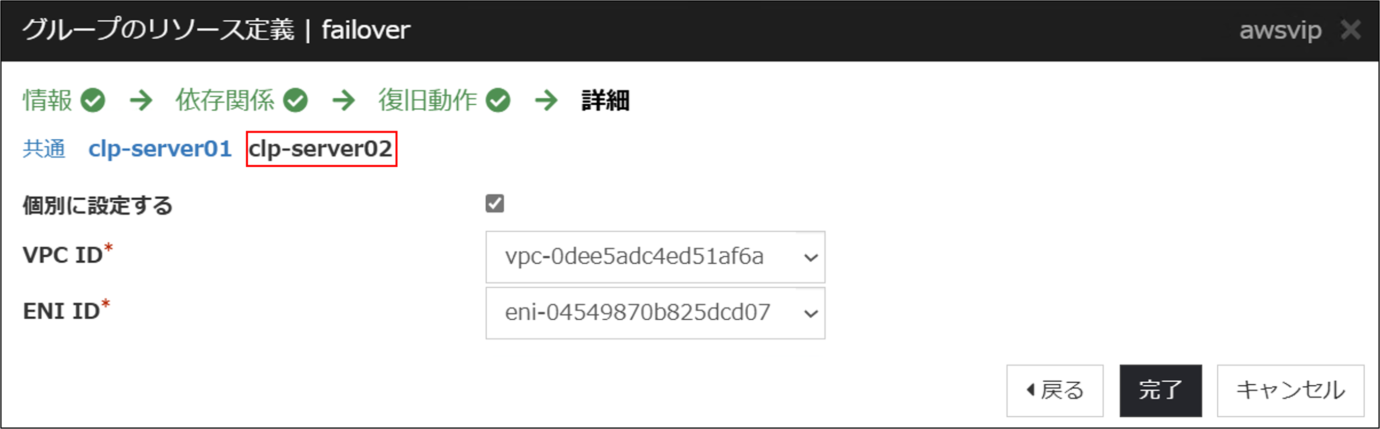 同様にclp-server02タブを開き、「個別に設定する」にチェックを入れます。VPC IDとclp-server02のENI IDを設定し、[完了]をクリックします。