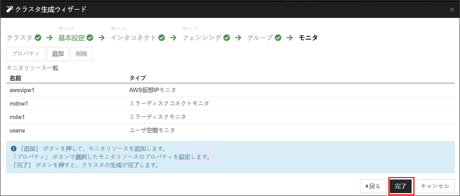 追加したグループリソースに応じてモニタリソースが追加されています。[完了]を押して設定を完了します。