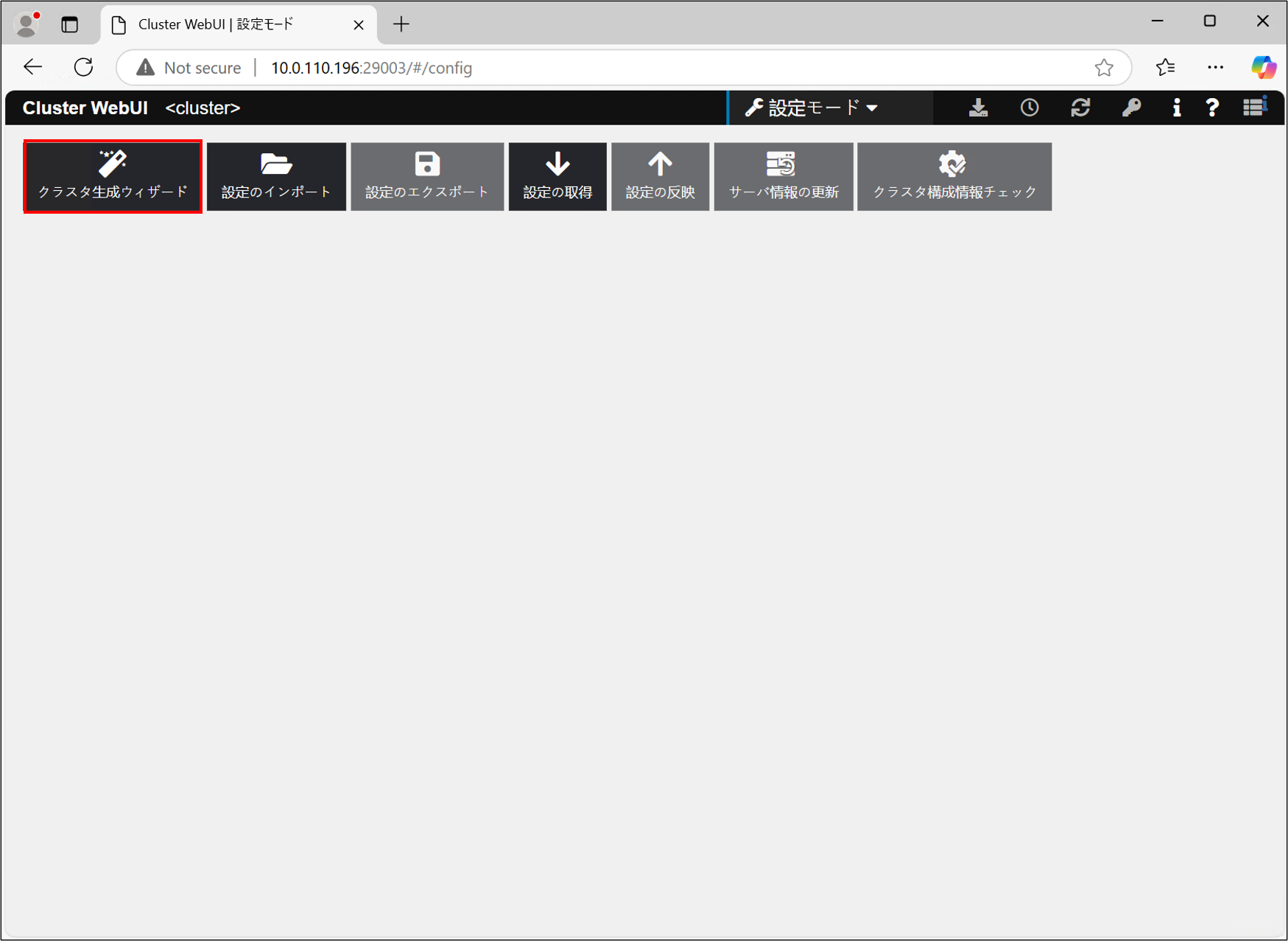 Cluster WebUIのダッシュボードが開きます。上部タブから設定モードを開きます。