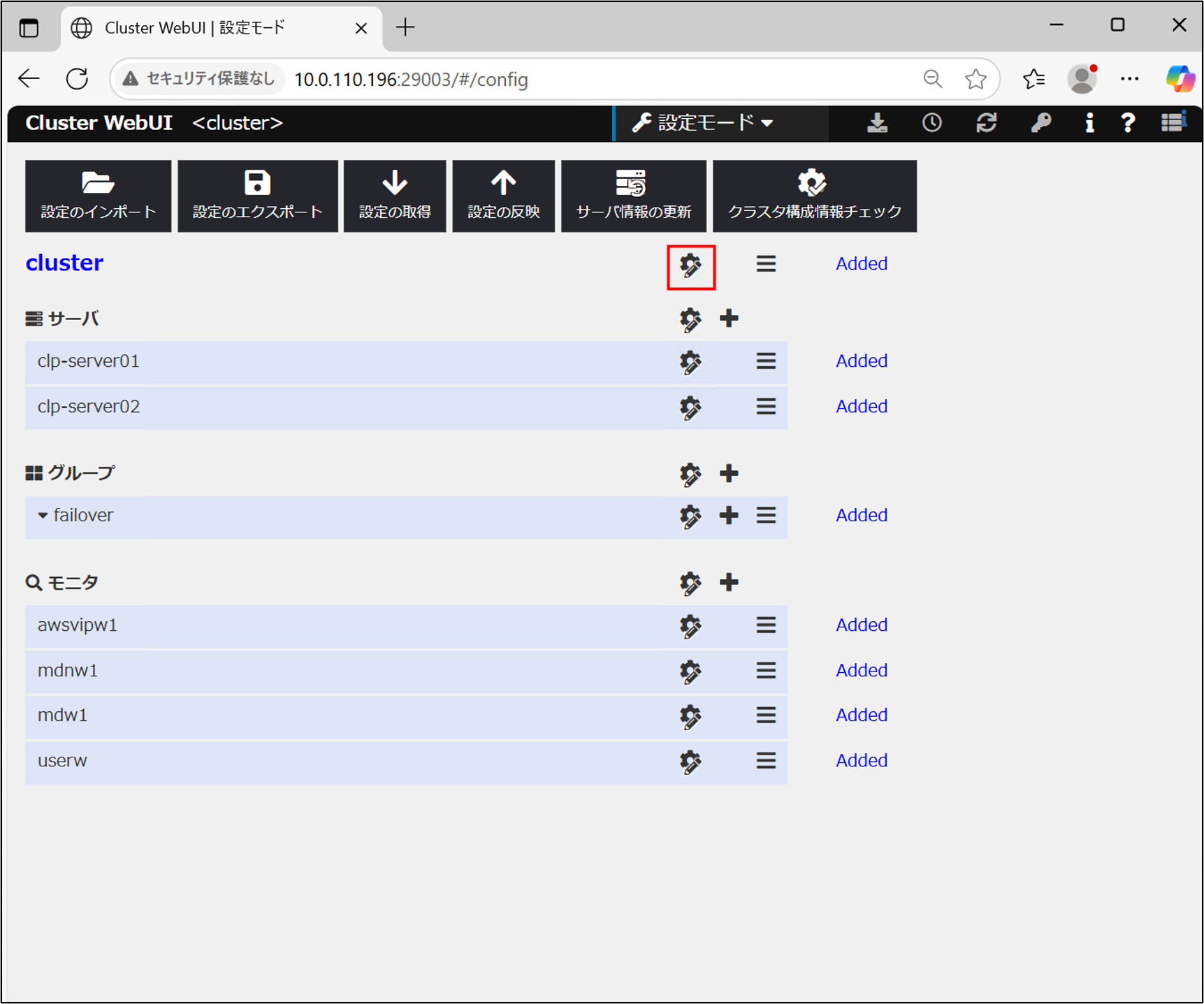 構成したクラスターリソースの一覧が表示されます。クラスターの設定を開きます。