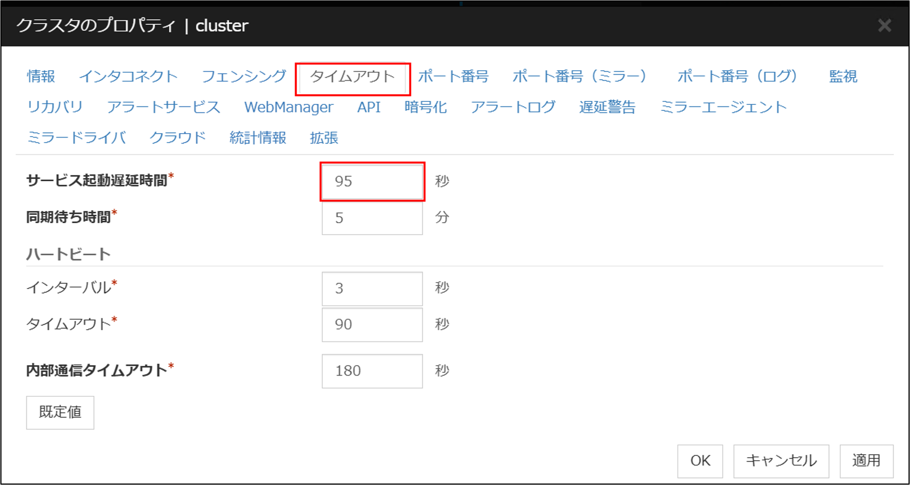 タイムアウトタブからサービス起動時間の設定を行います。サービス起動遅延時間をハートビートタイムアウト時間 + ハートビートインターバル時間より長くなるように設定します。今回はハートビートタイムアウトが90秒、ハートビートインターバルが3秒のため、95秒を設定します。
