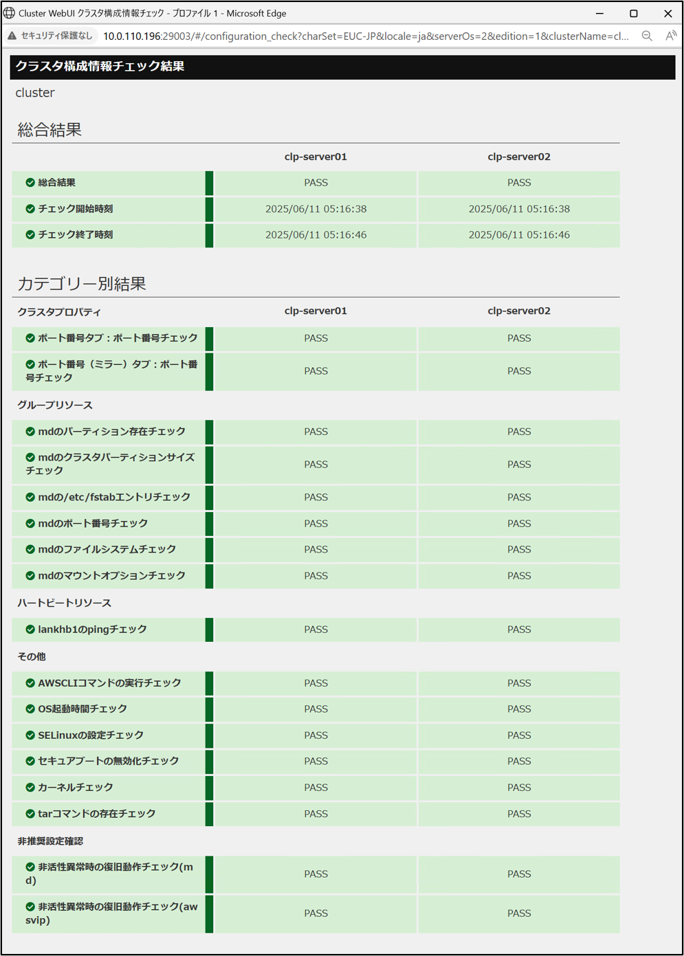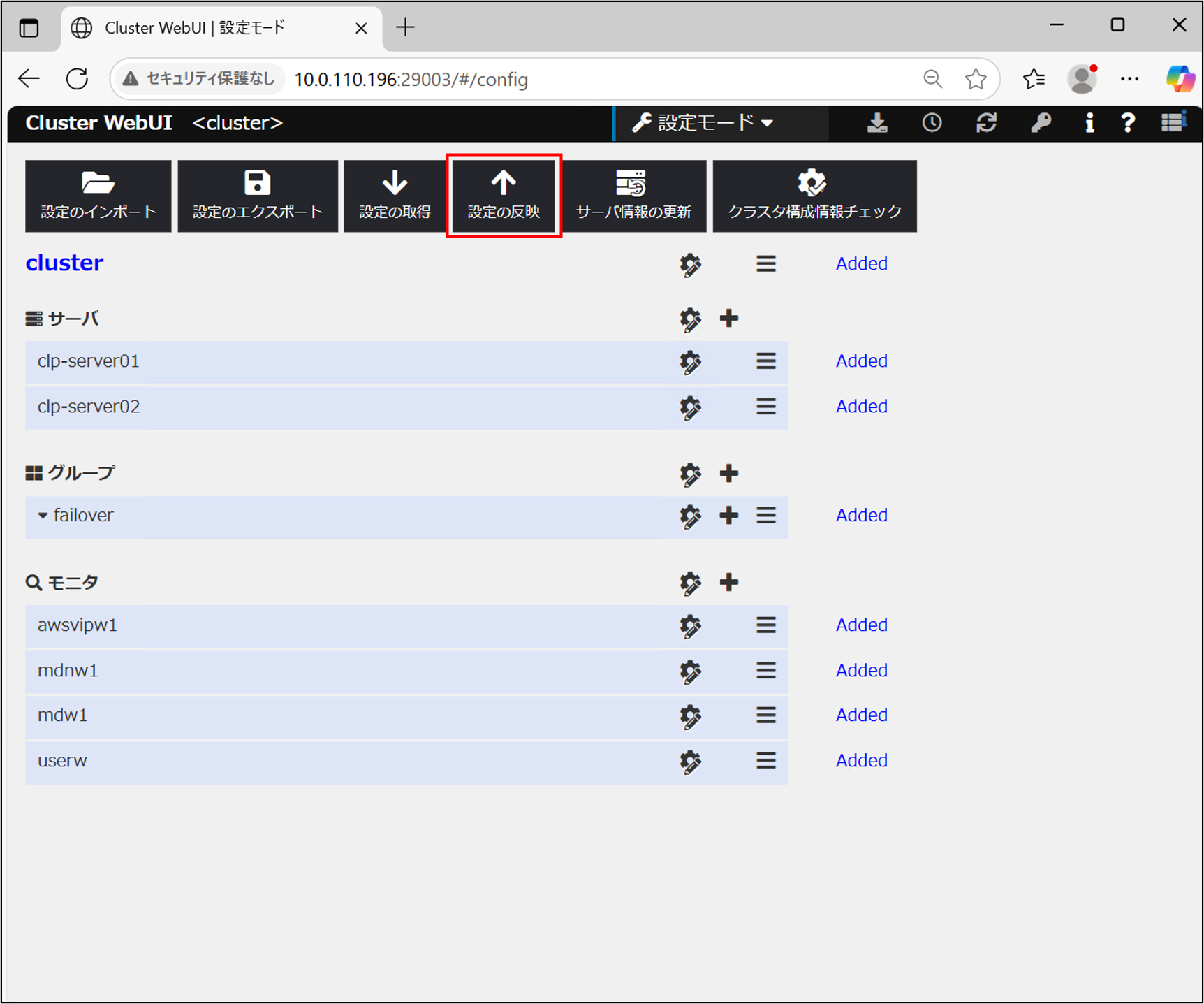 構成情報に問題がなければクラスタ構成情報チェック結果のウィンドウを閉じ、[設定の反映]を選択します。