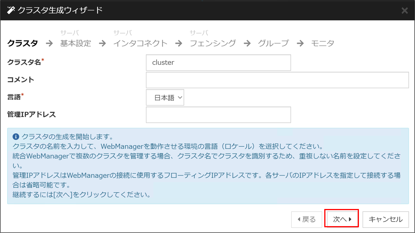 クラスタ名と言語は既定値のまま[次へ]を押します。
