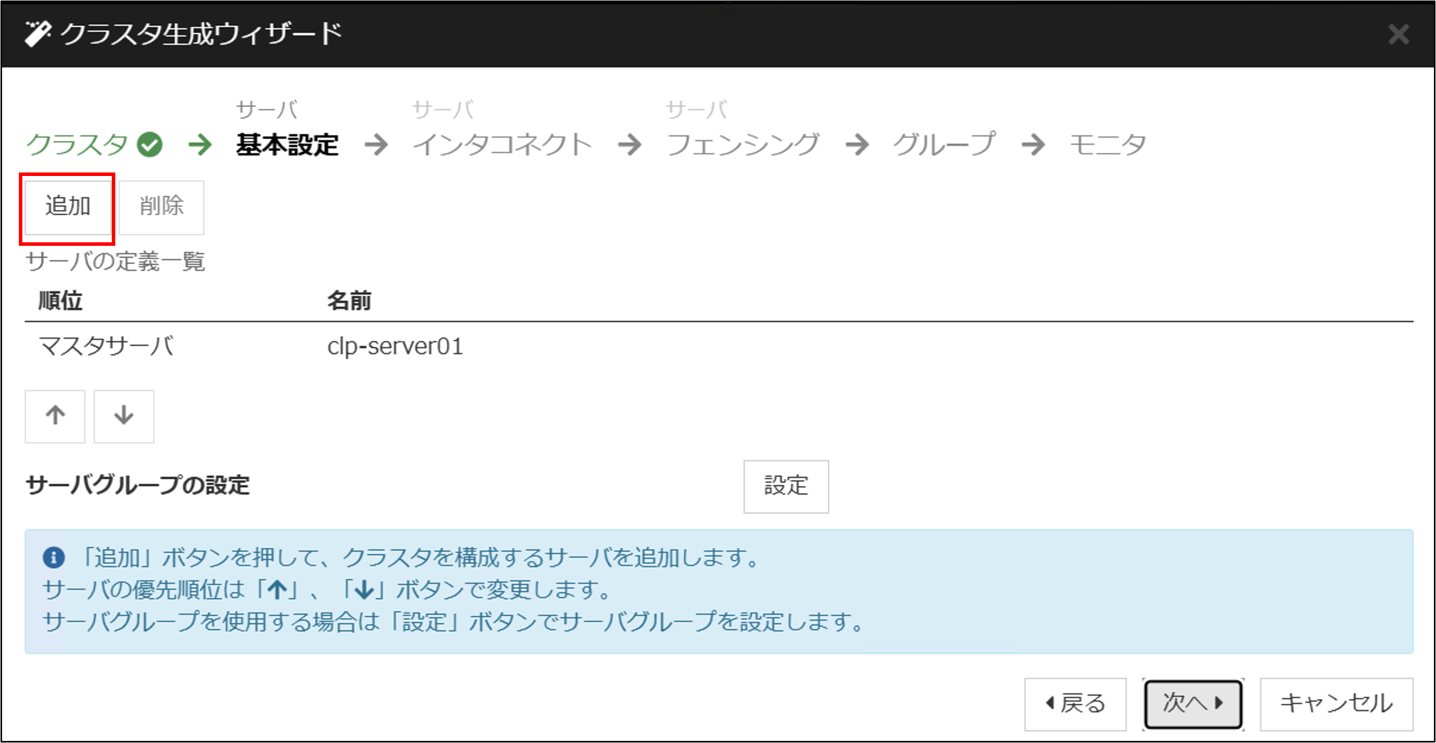 HAクラスターを構成するサーバーを追加します。[追加]をクリックします。