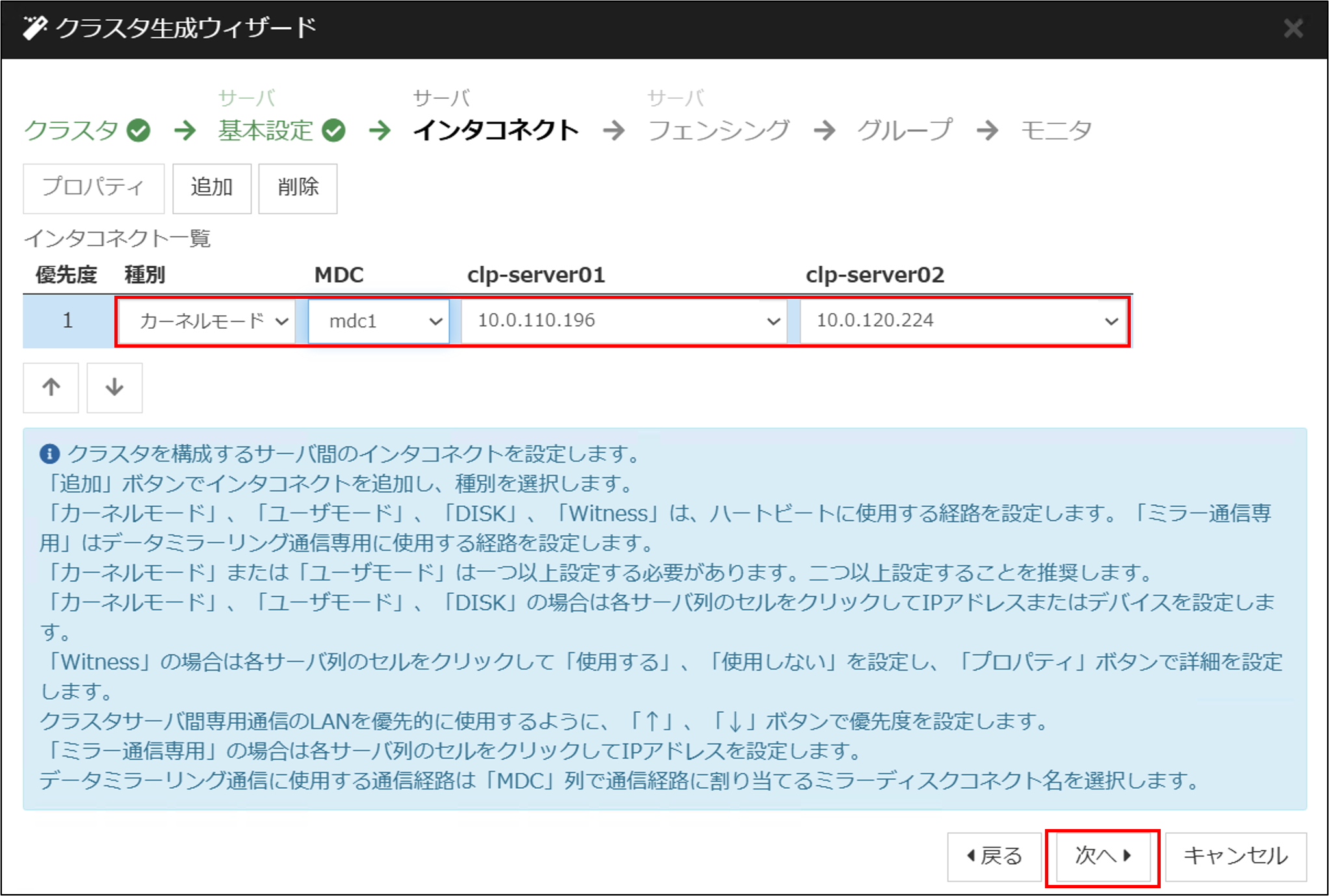 インタコネクトの設定をします。[追加]をクリックして通信経路を追加し、各インスタンスのIPアドレスを設定します。このインタコネクトはミラーディスクコネクト(データミラーリング通信に利用する経路)としても利用するので、[MDC]列をmdc1に割り当てます。これはミラーディスクリソースの設定時に使用します。