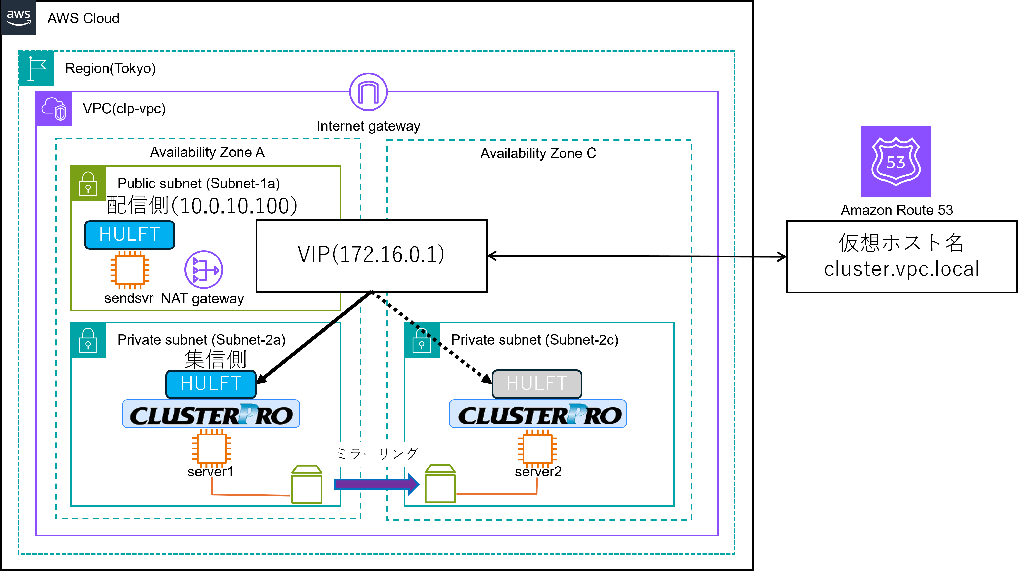 HULFTを冗長化する際のベースとなる「VIP制御によるHAクラスター」を作成します。VPCおよびCLUSTERPROの構成は以下のとおりです。今回は、CLUSTERPROのフェールオーバーグループには「AWS仮想IPリソース」と「ミラーディスクリソース」のみを登録した構成としています。