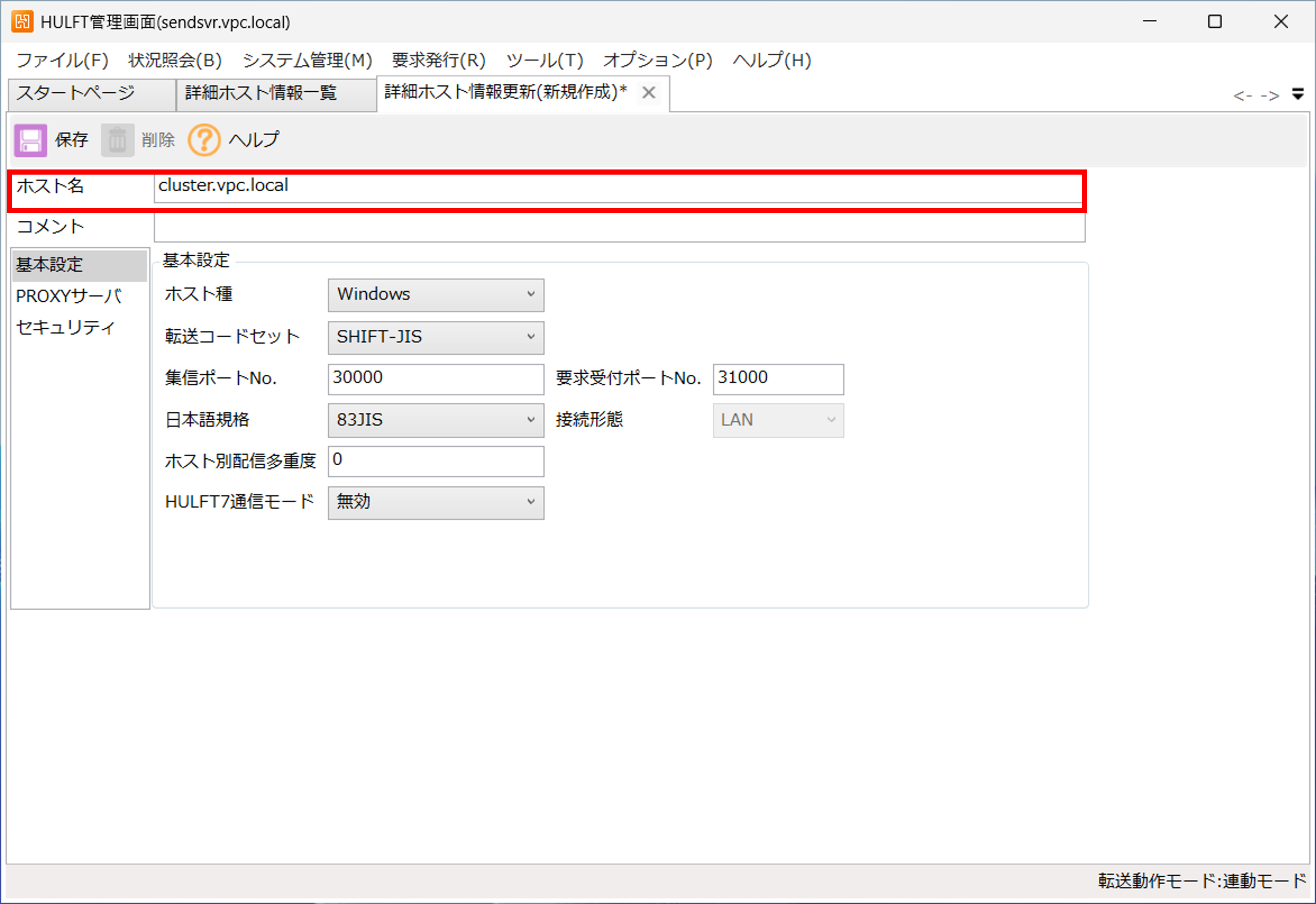 現用系インスタンス(集信側)にてHULFT管理画面を立ち上げます。「詳細ホスト情報」のアイコンをクリックし、配信側のホスト名を追加します。