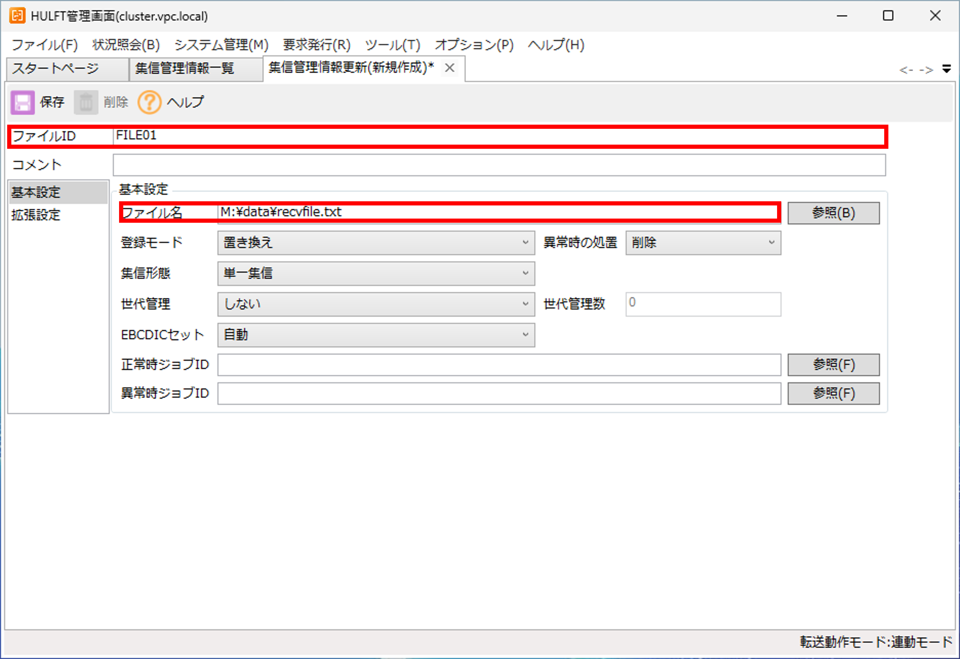 次に「集信管理情報」のアイコンをクリックし、配信側で設定したものと同じファイルIDを登録します。ファイル名には受信したファイルを格納するパスを指定しますが、集信側に格納されたファイルが自動的に待機系インスタンスにミラーリングされるように、データパーティション(Mドライブ)配下をファイルの格納先として指定します。