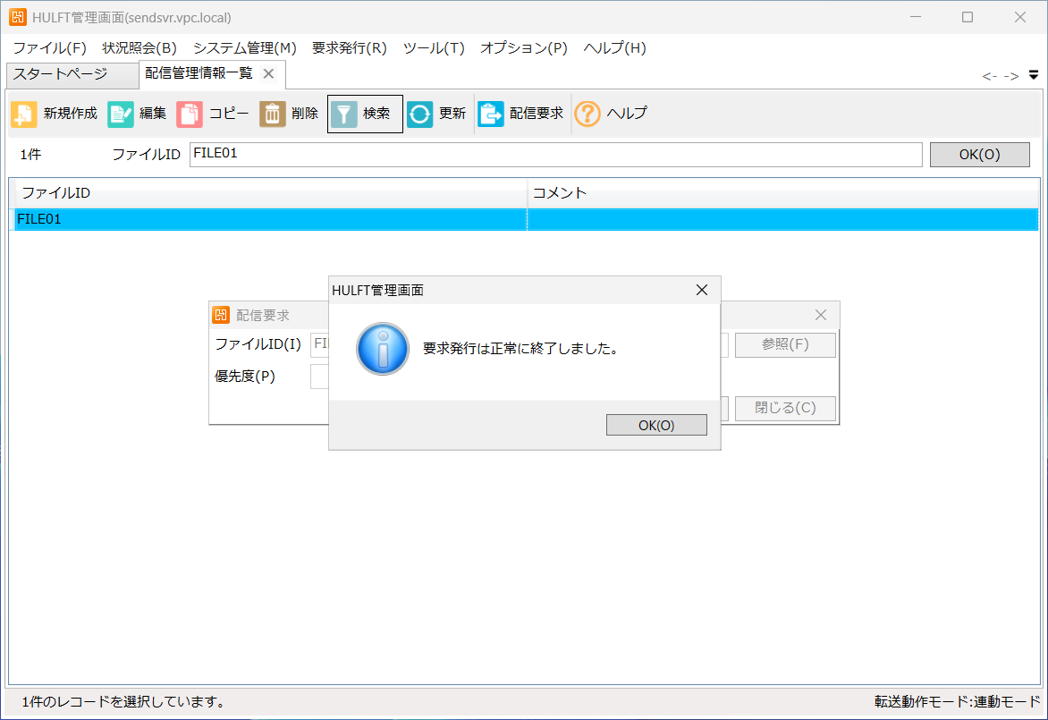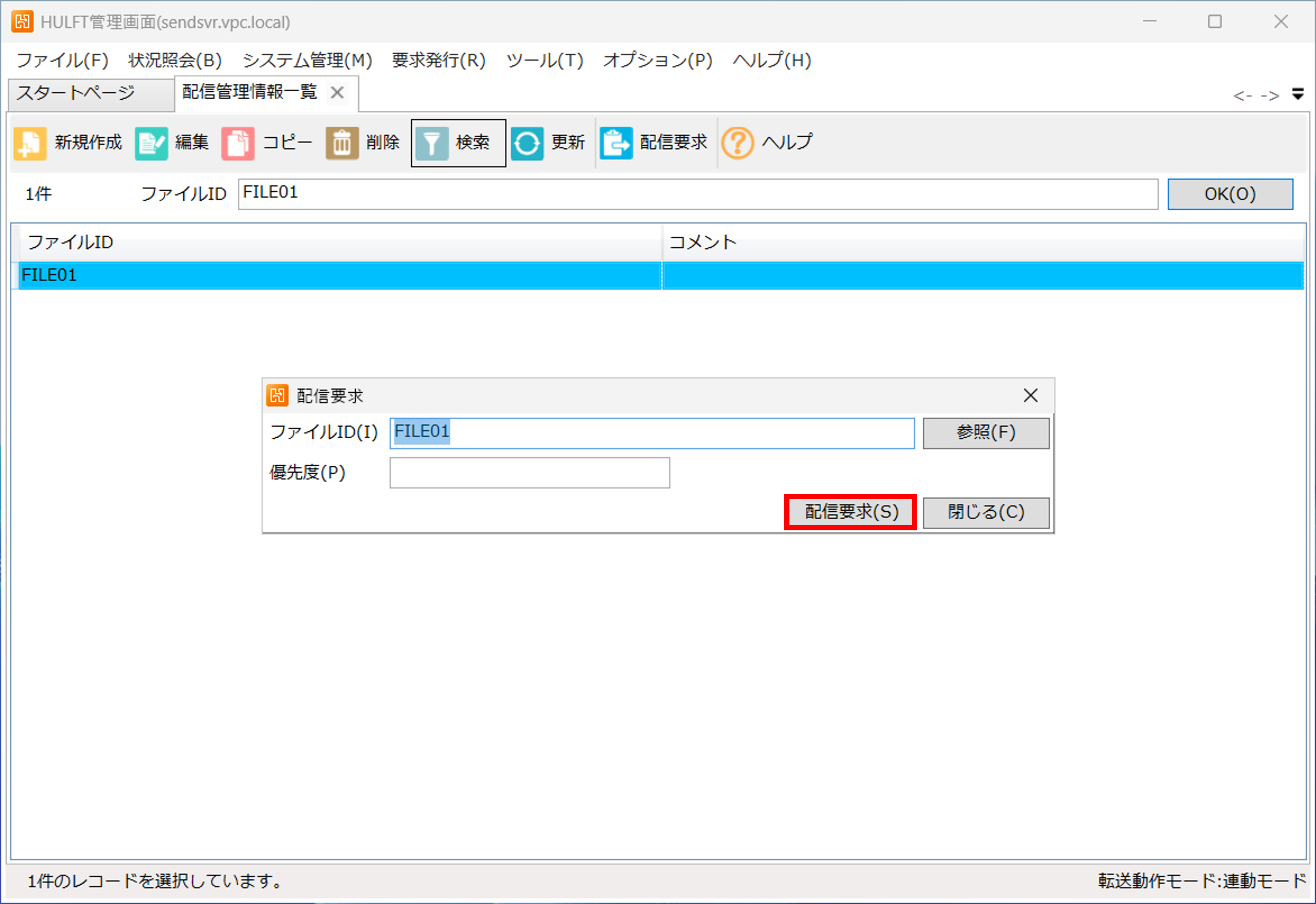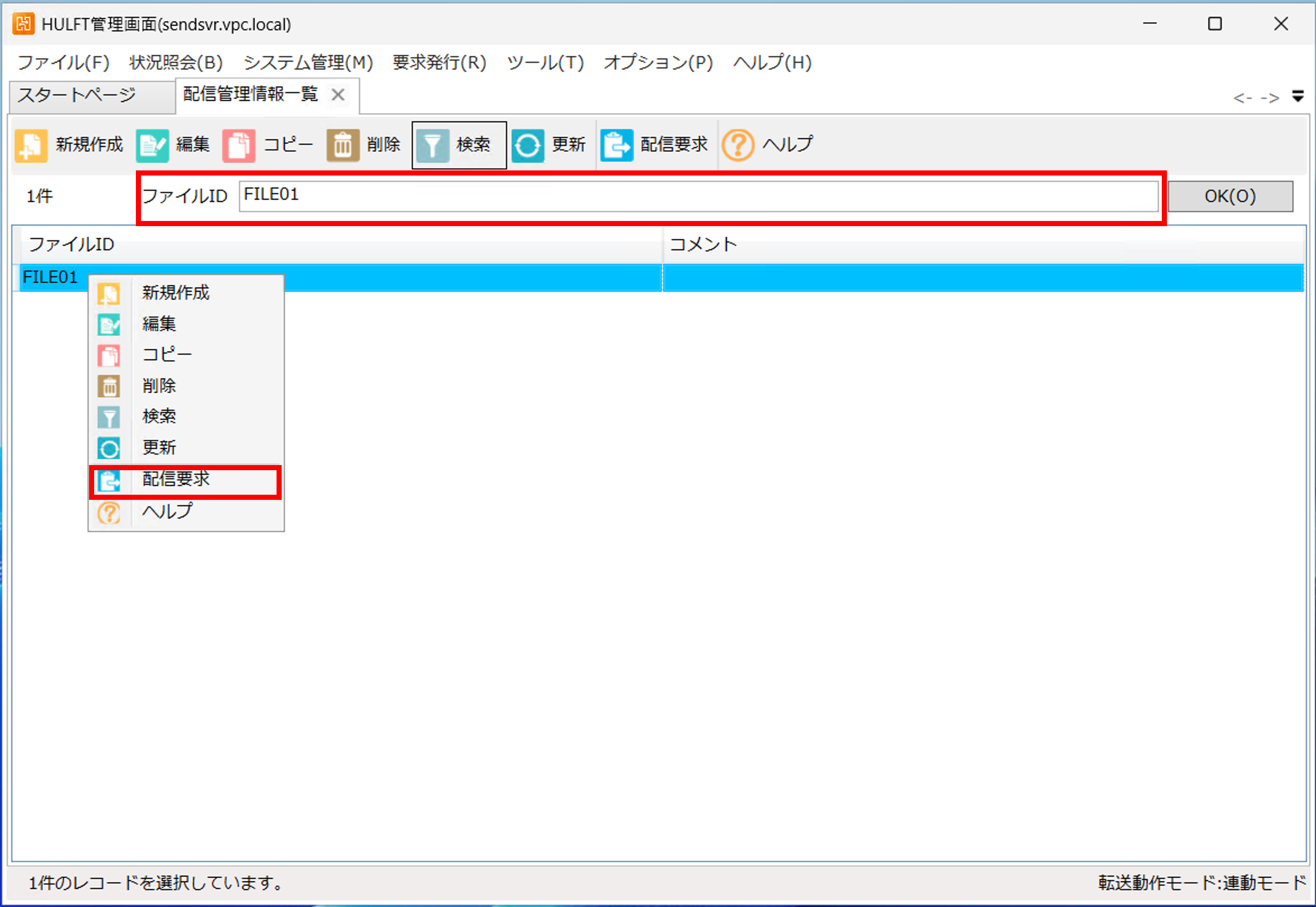 配信側のHULFT管理画面より「配信管理情報」のアイコンをクリックし、登録してあるファイルIDを選択します。右クリックで表示されるメニューから「配信要求」を選択します。