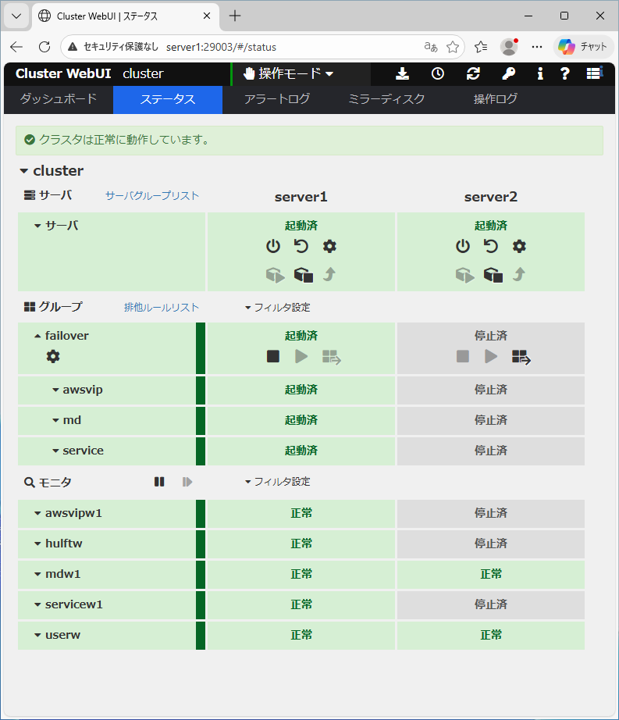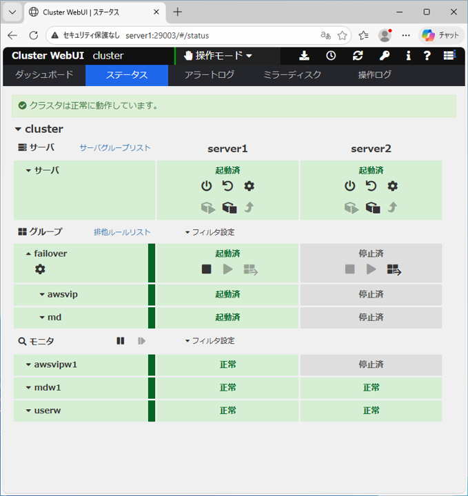 フェールオーバーグループにAWS仮想IPリソースとミラーディスクリソースを登録したら、各インスタンスでフェールオーバーグループが正常に起動できることを確認します。