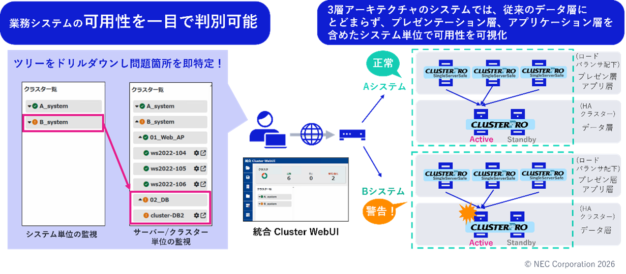 新商品では、3層アーキテクチャの業務システムにおいて、従来のデータ層にとどまらず、プレゼンテーション層、アプリケーション層を含めたシステム単位で可用性を可視化する「システムHA」に基づく運用管理環境を提供します。「システムHA」は、NECが新たに提案するHAクラスタリングを拡張した運用管理方法であり、個々のサーバーの健全性だけでなく、業務システム全体の稼働状況も一元的に把握することができ、システムの安定稼働を盤石なものとし、お客さまのビジネス継続性を強力に支援します。