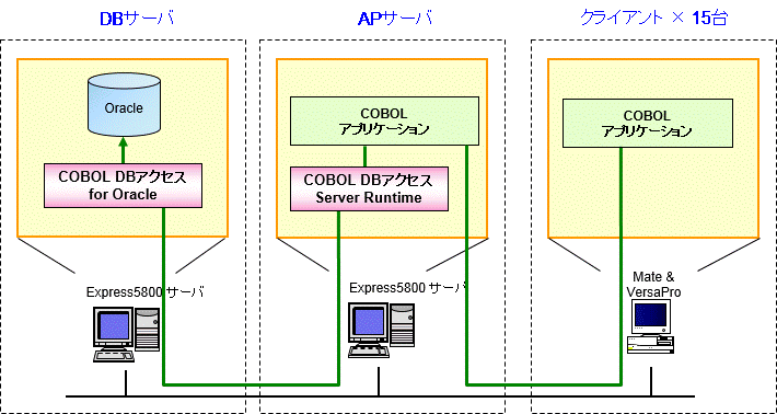 DBサーバにはDBサーバのコア数に応じたCOBOL DBアクセス for Oracleを、APサーバにはAPサーバ台数分のCOBOL DBアクセス Server Runtimeを購入していただく必要があります。また、接続するクライアント台数分のCOBOL DBアクセスClient Runtimeを購入していただく必要があります。