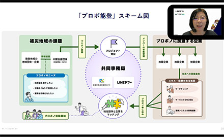 また、NECグループにて能登復興応援を推進するNEC能登がっぱ応援隊による”NECグループ社員向け「プロボ能登」紹介説明会”を開催しました。説明会では、LINEヤフー担当者様より「プロボ能登」の概要や今後のプロジェクトのご紹介、NEC能登がっぱ応援隊から本プラットフォーム加入の背景を説明しました。