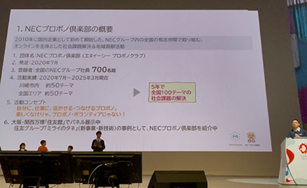 2025年5月28日、大阪・関西万博「EXPOホール」で開催され、約9,000名が来場した大阪・関西万博公式プログラム「防災万博」に、「NECプロボノ倶楽部」が登壇しました。NECグループのプロボノの取り組みと、SDGs視点での共創的な社会課題解決をテーマに現場から生まれた先進的な取り組み事例として、品川区との協働事業「自治体等と連携したメタバースを活用した防災まちづくりのための次世代向け教育支援活動」について発表しました。また、本活動に参加した次世代の子どもたちからは、成果物である作品等が発表されました。