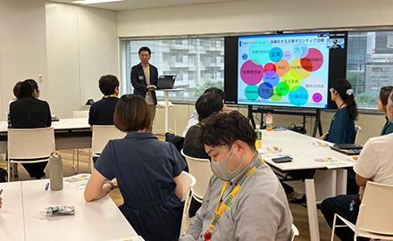 本セミナーは全国のNECグループ社員130名以上が参加し、講義では災害ボランティアや災害時にどのような支援が可能か、災害前にできることについて学びました。講義後のワークショップでは、「災害が起きたばかりの時に社員がボランティアに行きたいと言ったら、チームリーダーのあなたはそれを許可するか?」「会社らしさを出すために商品の寄贈をするのか、社員ボランティアで支援するのか?」など、災害時に起こる状況についてグループディスカッションを通して、災害ボランティアについて理解を深めました。
