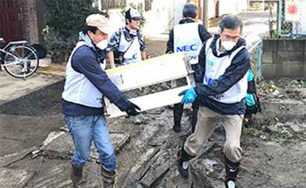 2019年10月に発生した令和元年台風19号被災地支援の一環として、社内売店のPOSを活用したキャッシュレス社員募金等を実施し、緊急災害NGOである特定非営利活動法人ジャパン・プラットフォームへ贈呈しました。また、川崎市災害ボランティアセンターや東京ボランティア・市民活動センター等と連携し、被災地である川崎市や福島県いわき市等において、社員約60名が参加し、がれきの撤去等の支援活動を実施しました。