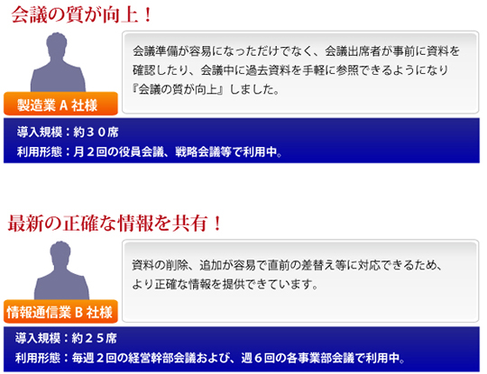 実際にペーパーレス会議システム「ConforMeeting/e」を導入いただいたお客様からのコメントをご紹介します。
