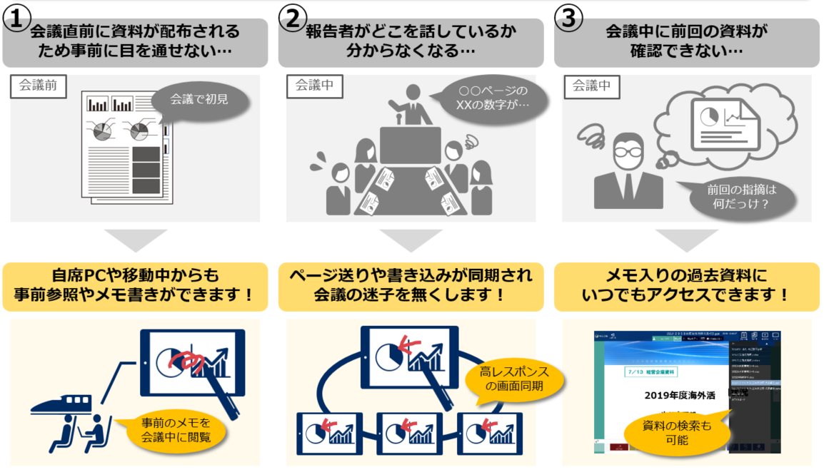 高度情報化社会において、変化の激しい市場動向にいち早く対応することは企業が生き残るためには必須であり、企業内でいかに速く課題を解決していくかが重要です。ペーパーレス会議は、資料確認や情報共有が容易になることで議論に集中でき、かつ常に最新の資料で情報鮮度を保ち議論の質を高めるという利点があります。