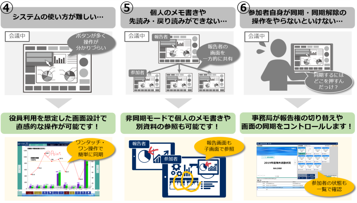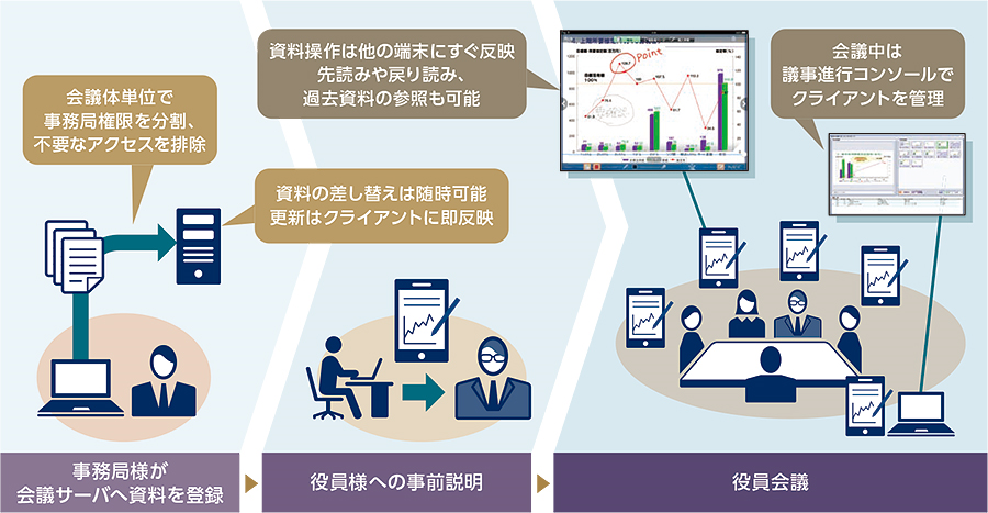 出社困難な状況や遠隔地から参加される場合でも、従来からの対面の役員会議と同様に、事務局の事前段取り・司会進行によって効率的に進めることができます。