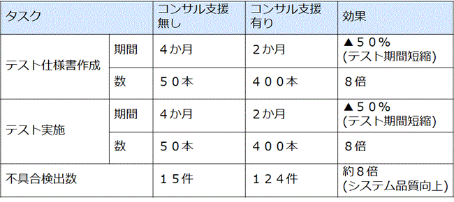 - 過去実績ですが、約50%のテスト期間の削減、および8倍もの不具合検出を実現しました。