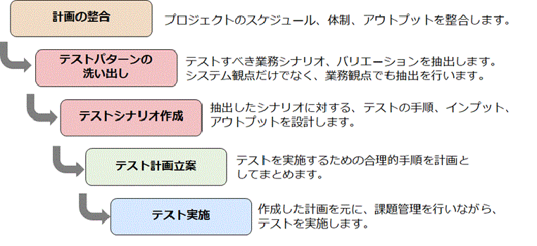 - 各テストは以下の進め方で、仕様書作成からテスト実施まで進めます。