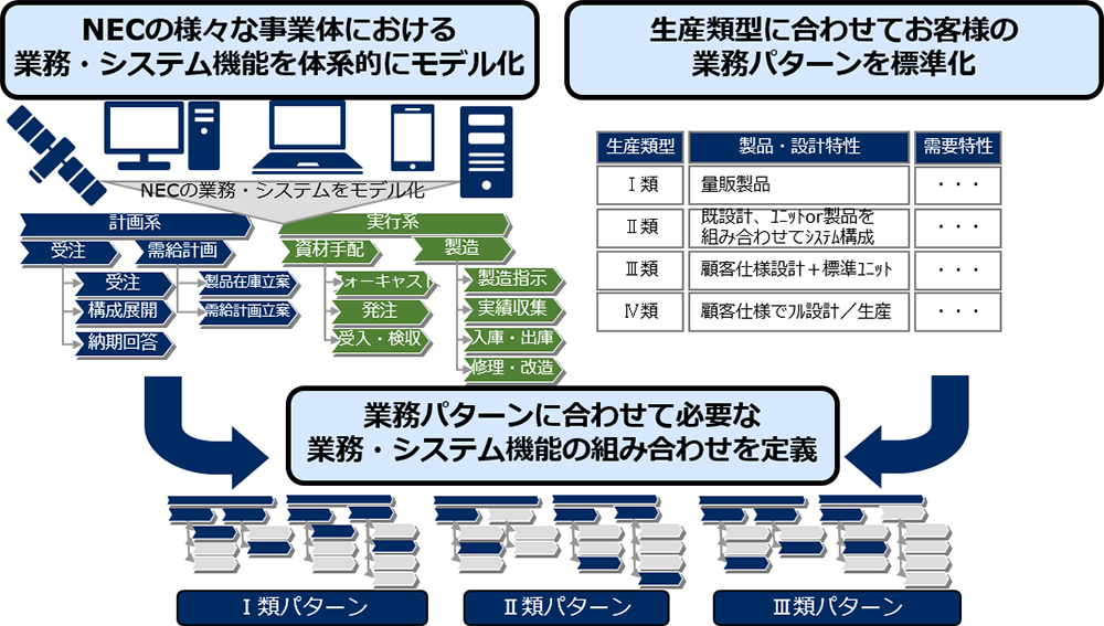 - 衛星からパソコンまで様々な事業体を保有しているNEC自身の業務・システム革新実績などをもとに、標準モデル化