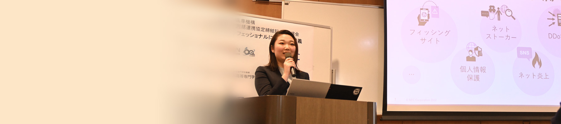 サイバー攻撃の脅威が増す中、デジタル社会の安心と安全を守るサイバーセキュリティ人材の育成は日本全体にとって急務です。人材育成とDX(デジタルトランスフォーメーション)推進はNECにとっても経営の柱の一つ。社内育成だけでなく、教育の資源を社外にも広げたい。NECはPurposeで掲げる社会価値創造への取り組みとして、高等専門学校(高専)にNECのノウハウを提供します。未来を担う人材育成のためにNECができることは。