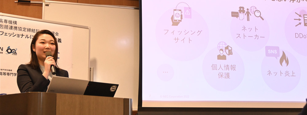 NECは以前から高専とは協力関係にありましたが、人材不足の深刻化を受け、連携をパワーアップ。今年7月には、独立行政法人国立高等専門学校機構と包括連携協定を結び、全国51の国立高専にNECの最新のセキュリティ技術に基づいた教育サポートを行う態勢を整えました。協定には教職員と技術者の定期的な情報交換も盛り込まれており、今回の出前授業は情報交換がきっかけで企画されました。