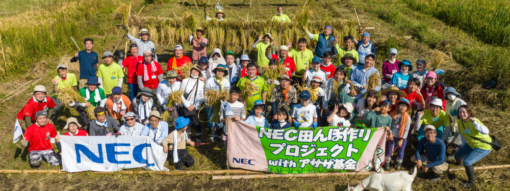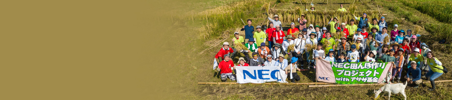 荒れた田んぼを再生し、様々な生きものが暮らせる環境を再生する。そのために社員と家族で、田植えからお酒造りまで行い、自然からの恵みを学び体験する。そんなNECグループの「田んぼ作りプロジェクト」が2023年4月で20年目に入りました。かつて大人の腰ぐらいの背丈だった子どもは今や大学生になり、とある社員にとっては「NEC生活で最も長いプロジェクト」に。この一大プロジェクトを続けられた背景にある「NECのDNA」とは。