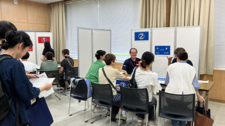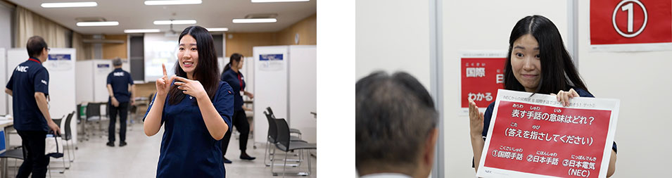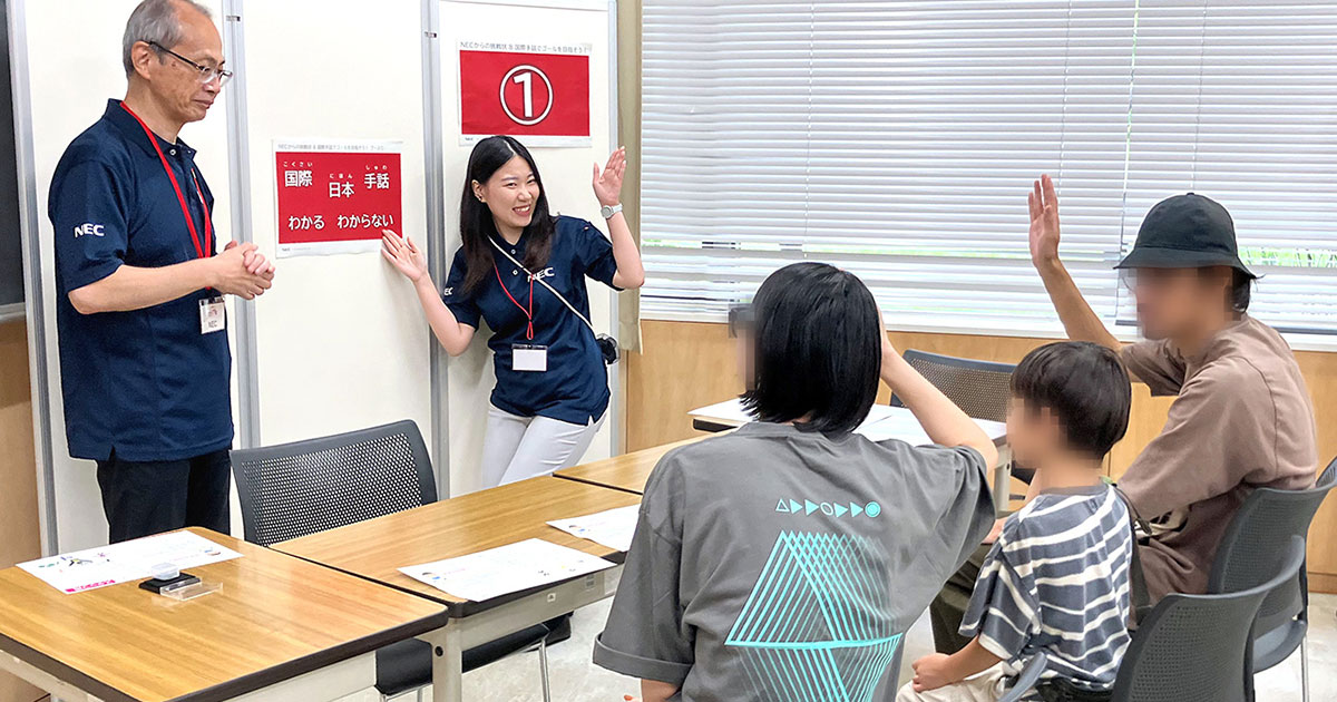 NECは、国際手話体験ワークショップ「NECからの挑戦状」を出展。国際手話の簡単なレクチャの後、「迷子になっちゃった!国際手話で場所を聞いてみよう」など5問のクイズに答える謎解きスタイルのこの企画は、例年、事前予約だけで満員となるほど大人気。今年も定員を超える80人以上が参加し、盛況となりました。