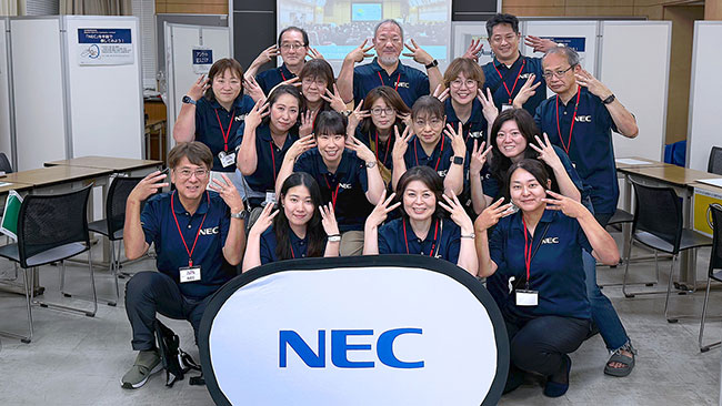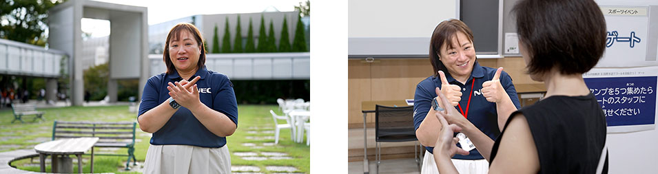 NECのワークショップを運営したのは約20人のNECグループ社員です。当日の案内はほぼ手話で行うため、事前に手話勉強会で教え合うなど準備も一苦労。ではなぜ、NECグループ社員がこうしたイベントをサポートするのか。その問いへの答えとして「NECってすごい大きな会社ですよね」と切り出したのは、この企画のとりまとめを担当するNECの鈴木真紀です。「様々なインフラを支えている信用がある会社が聞こえない人をバックアップする環境をつくることは、非常に大きな意味を持つ」といい、だからこそ「技術だけではなく、いろいろな意味で社会をリードする会社であってほしい」と続けます。